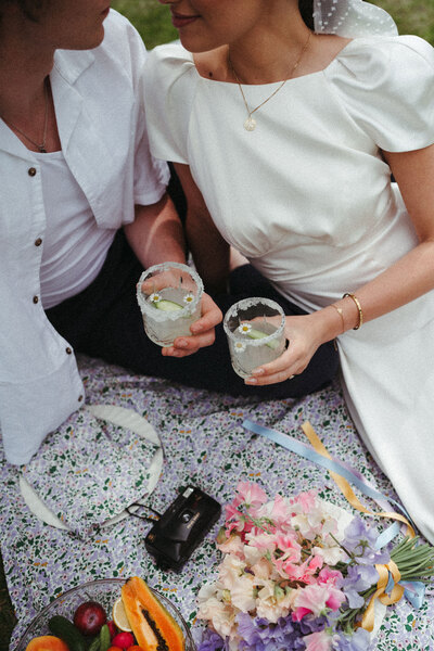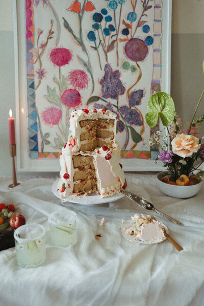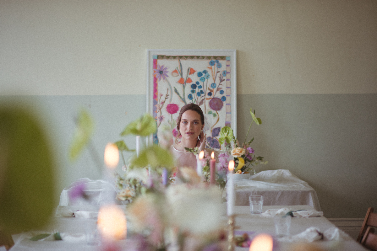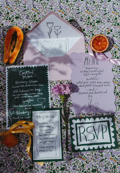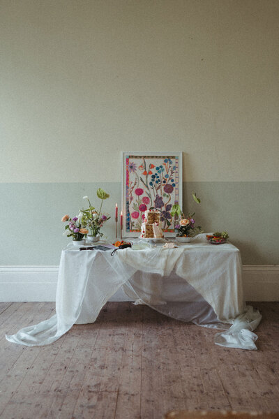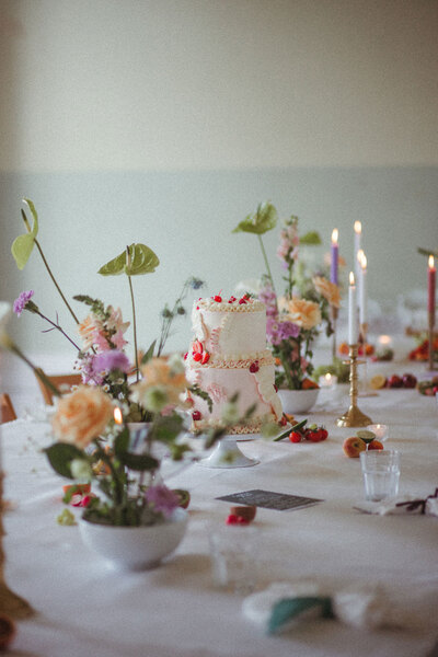 Vibrant artwork, playful stationery and a strawberry-dotted cake with wavy piping bring joyful – and artfully crafted – character to the venue. “The house is filled with so much charm, with its exposed plaster and impressive sash windows. The possibilities are endless when considering how to style the space as it offers a blank canvas but with bags of character,” says Rebecca. “Around every corner there is something new to discover and different seasons will provide their own benefits. For me, however, spring is when Enys comes alive with its abundant florals.” And this shoot illustrates the enchantment of the season beautifully.