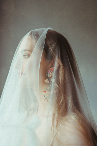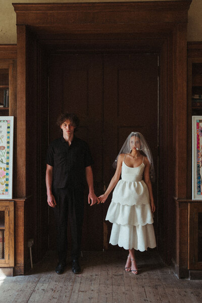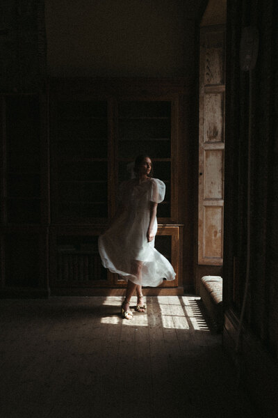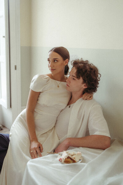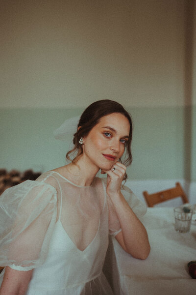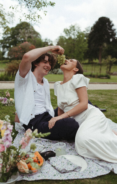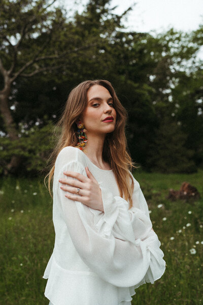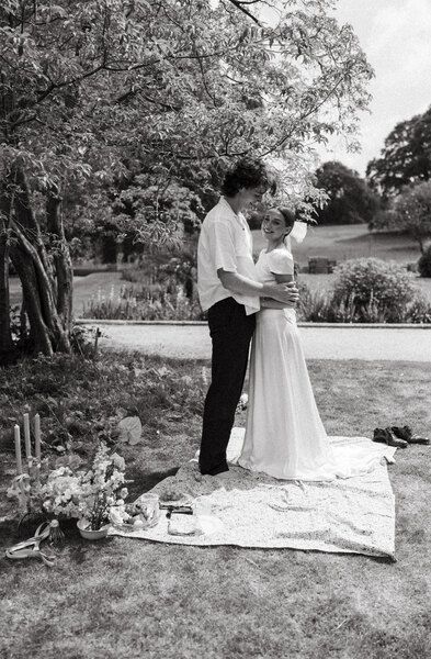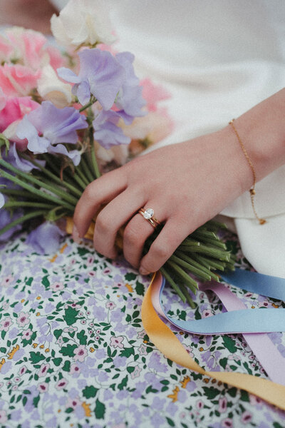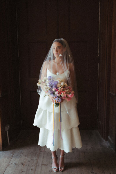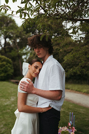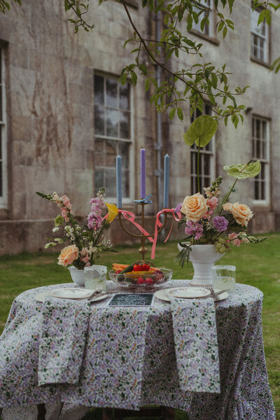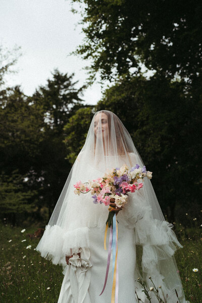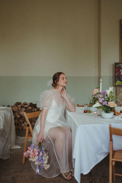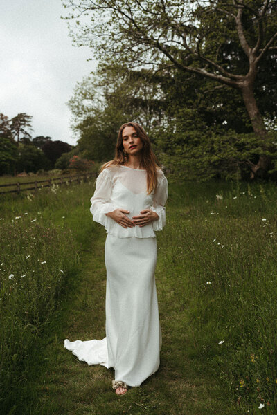 Inspired by her love of spring and the romanticism of the season, photographer Rebecca Hook dreamed up the concept for this beautiful shoot at Enys, with its Mansion House and historic gardens. “Romanticism and femininity generally go hand in hand, and I wanted to capture that through the softness of the fabrics, the delicate bouquet of sweet peas and the all-female owned suppliers used,” she explains.