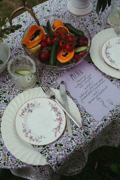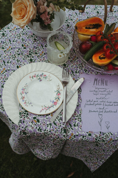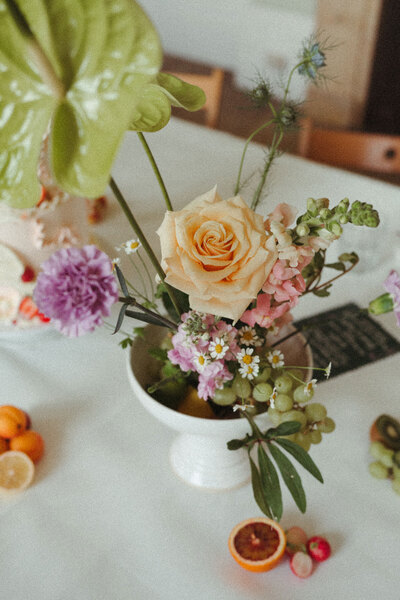 The florals are key to creating the dreamy spring scene. “We used small bowls and created a playful balance of interesting and classic blooms,” she says. “This adds depth and complexity as well as providing visual beauty; the ribbons introduce a bit of fun and texture.”