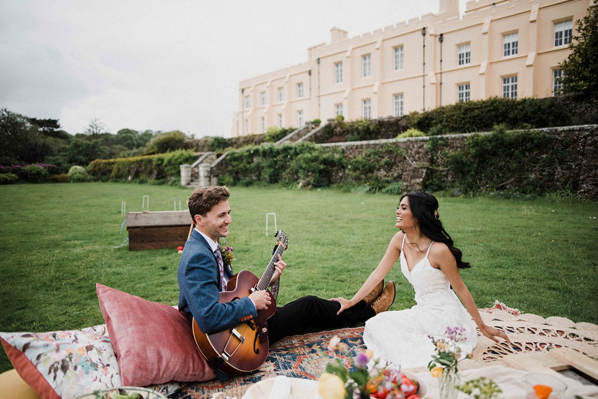 With its far-reaching views, the Old Tennis Lawn makes the perfect setting for a picnic. A wooden palette makes an ideal low-level table for the carnival of seasonal, locally sourced flavours; edible flowers add a pretty touch to the cocktails and cushions made from scraps of material are perfect for lying back and savouring those blissful newly married moments while watching the clouds slip by.