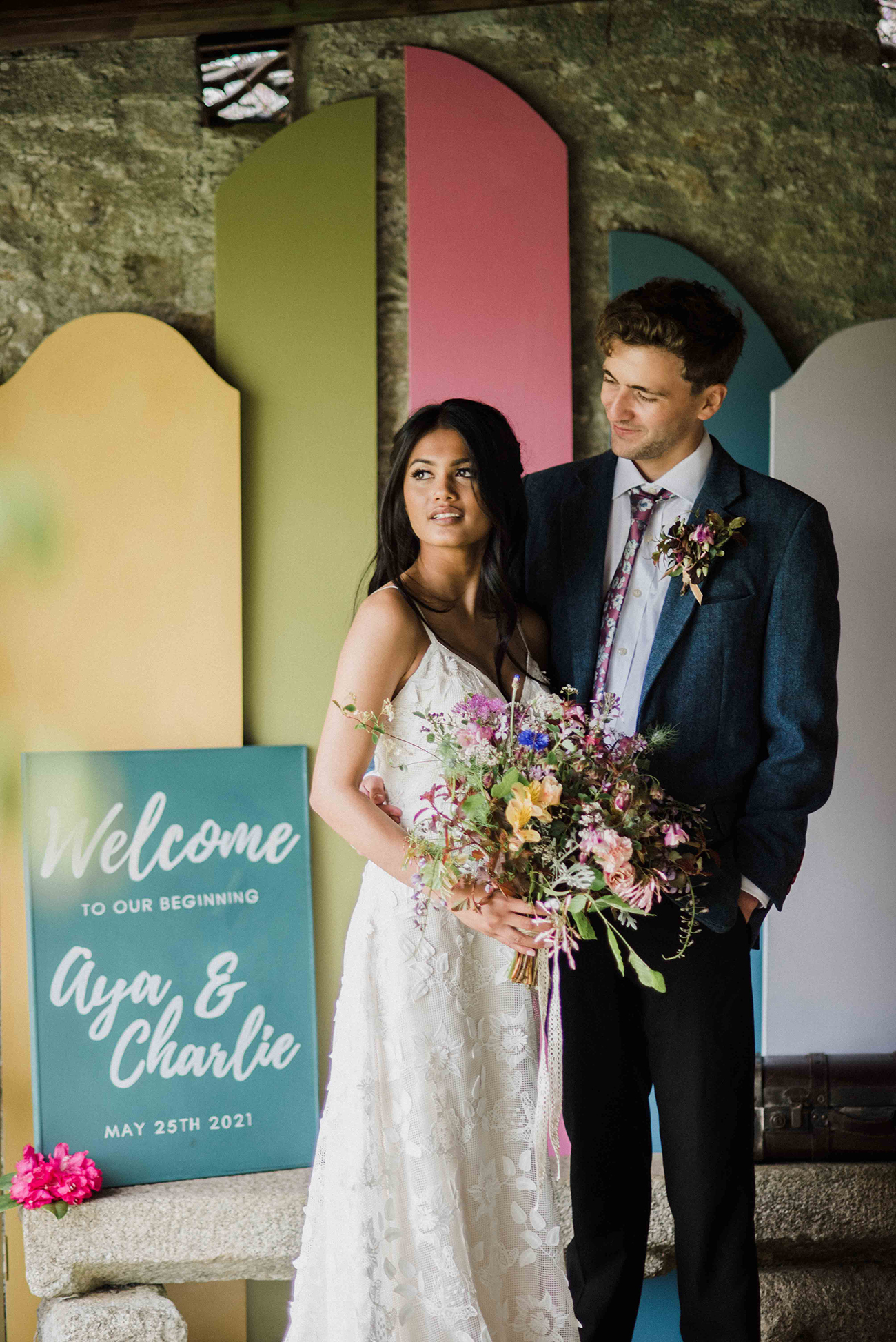 The uplifting colour palette reflects the vibrance of the flower-filled setting. Grown just a short distance from the venue in Liskeard, the bridal bouquet from The Flower Mill Cornwall captures the wildly beautiful vibe of the shoot with its just-gathered aesthetic and vivid shades of pink, purple, blue and yellow. The colours echo the ceremony backdrop, crafted from upcycled wood, and the stationery made from recycled card and prettified with vibrant blooms and butterflies.