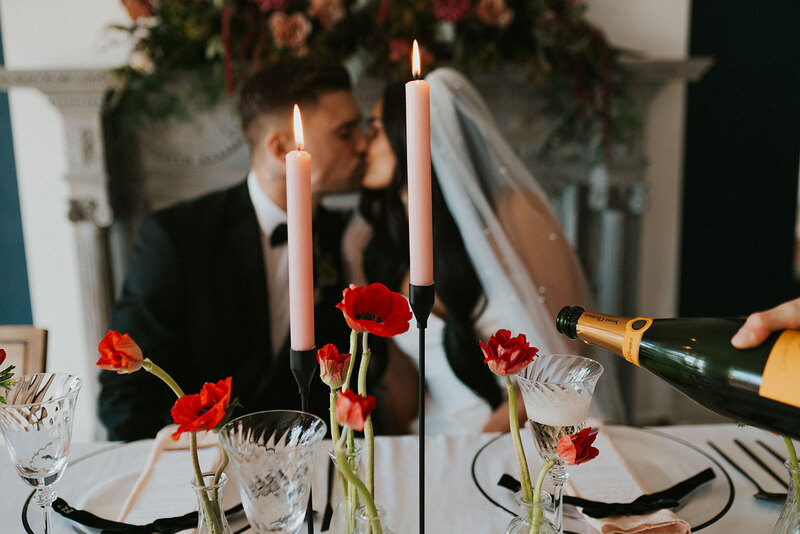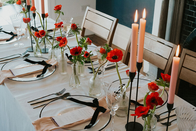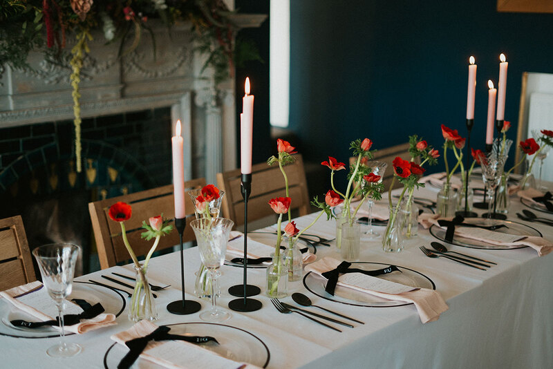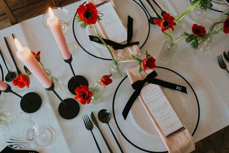 The tablescape reflects modern minimalism with a striking black-and-white palette, softened by vibrant red anemones in clear glass vases and the gentle glow of blush pink tapered candles. This chic and eye-catching design perfectly complements the venue’s contemporary charm.