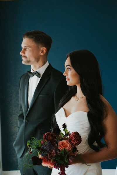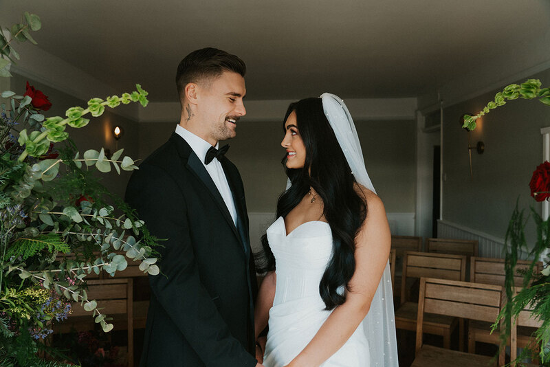 The bride exudes high glamour in a sleek, corseted gown paired with soft waves, creating a look that’s effortlessly sophisticated. Beside her, the groom looks equally dashing in a classic tuxedo, epitomising the black-tie aesthetic.