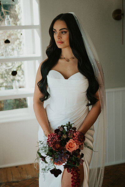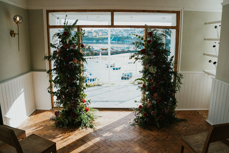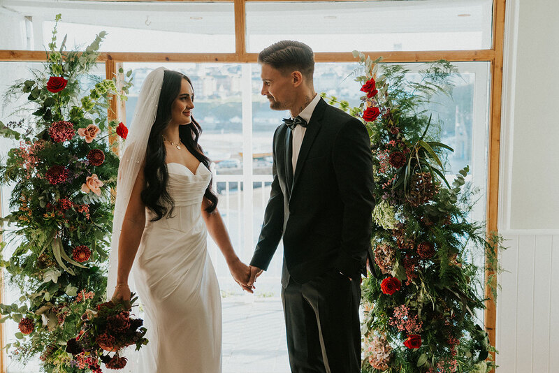 A lush installation of greenery, adorned with bold blooms in rich shades of crimson, burgundy and red, frames the panoramic views of the harbour, sandy shores and endless ocean, setting the scene for an unforgettable ceremony.