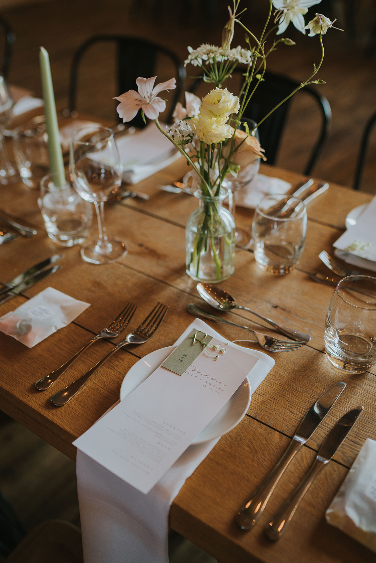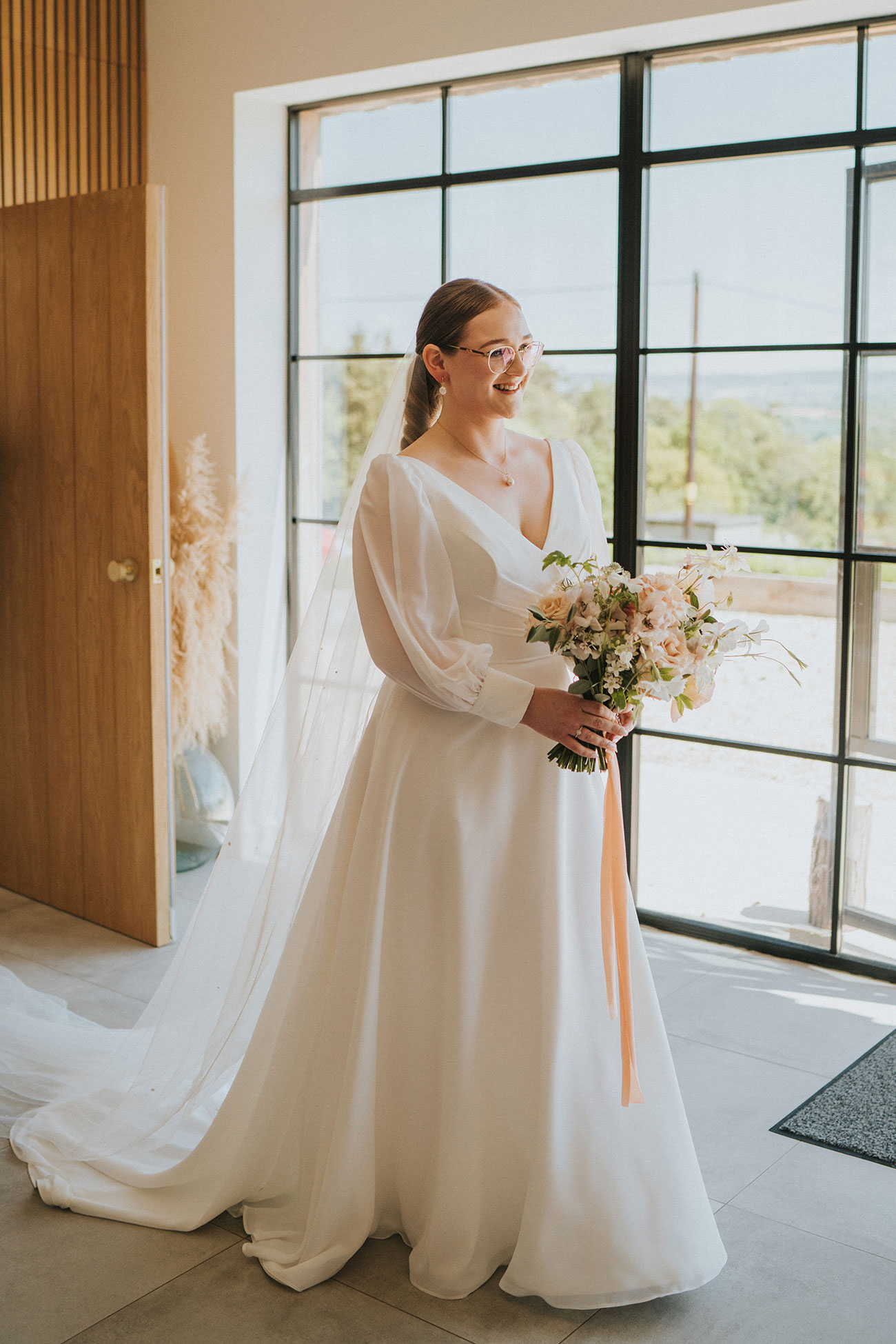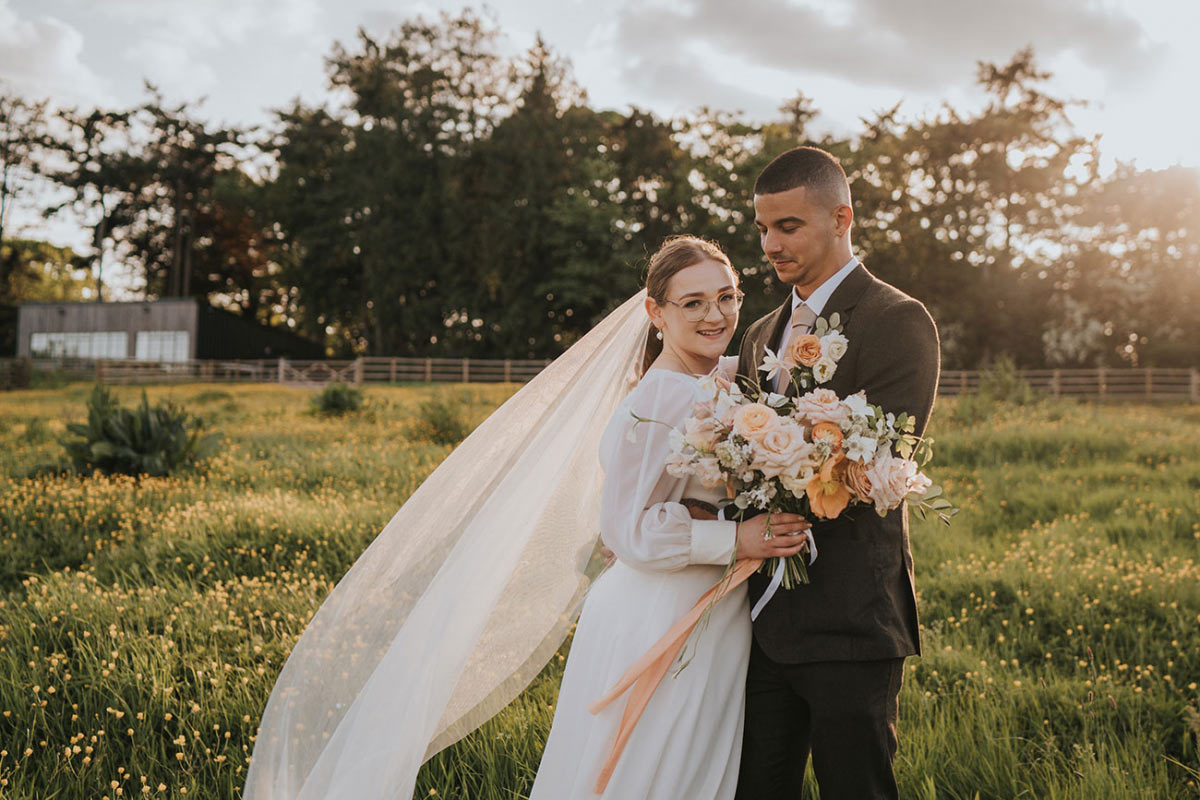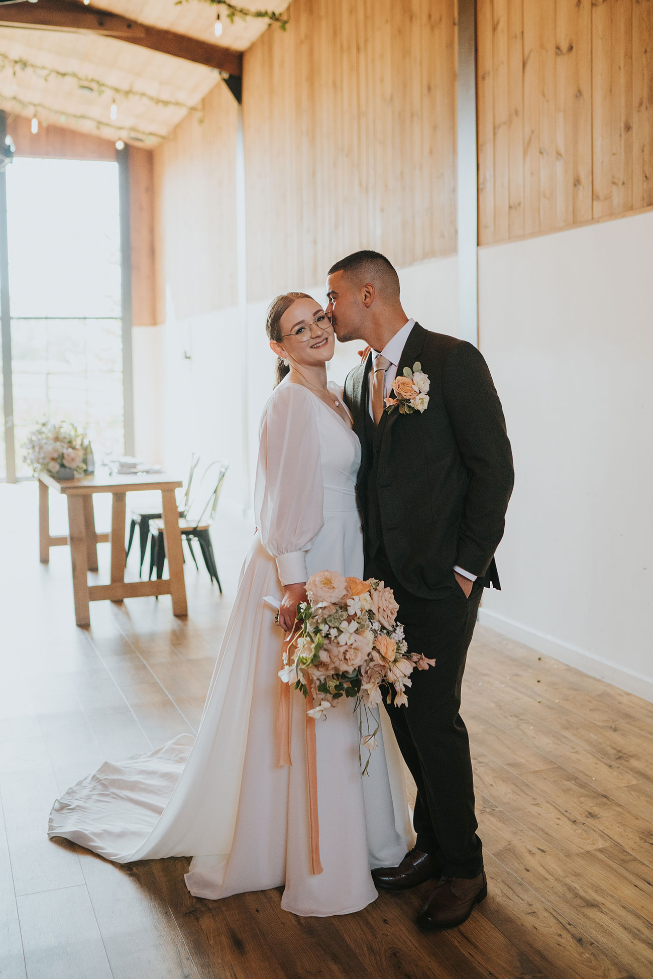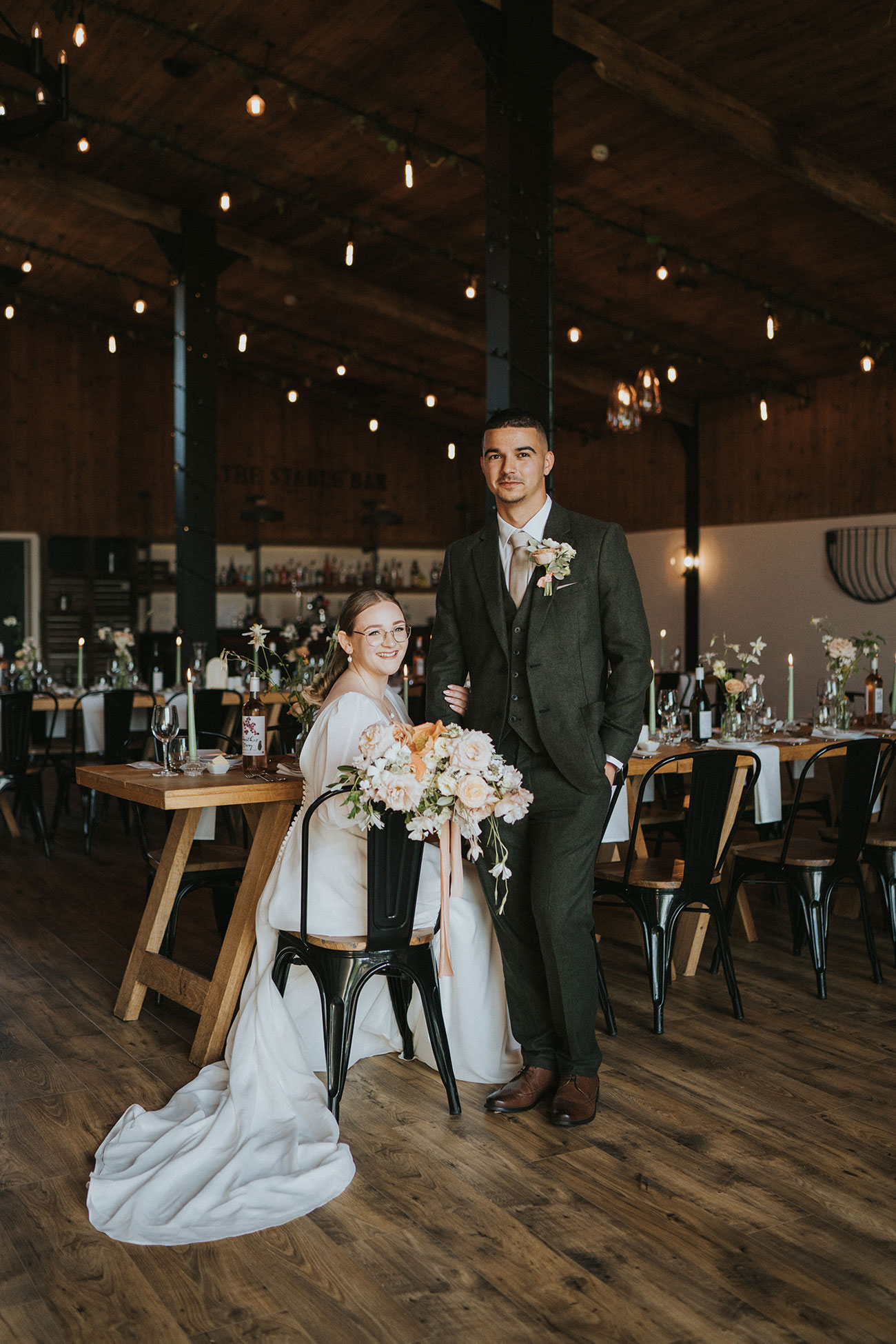 When it came to choosing their wedding venue, there was one location that stood out. “The moment we walked into Upton Barn, we both knew it was where we wanted to get married,” she says. Settling on a calming colour scheme of “neutrals with peachy splashes”, the floral arrangements carried the palette beautifully, with a foliage garland around the ceremony arbor and stem flowers throughout the venue.