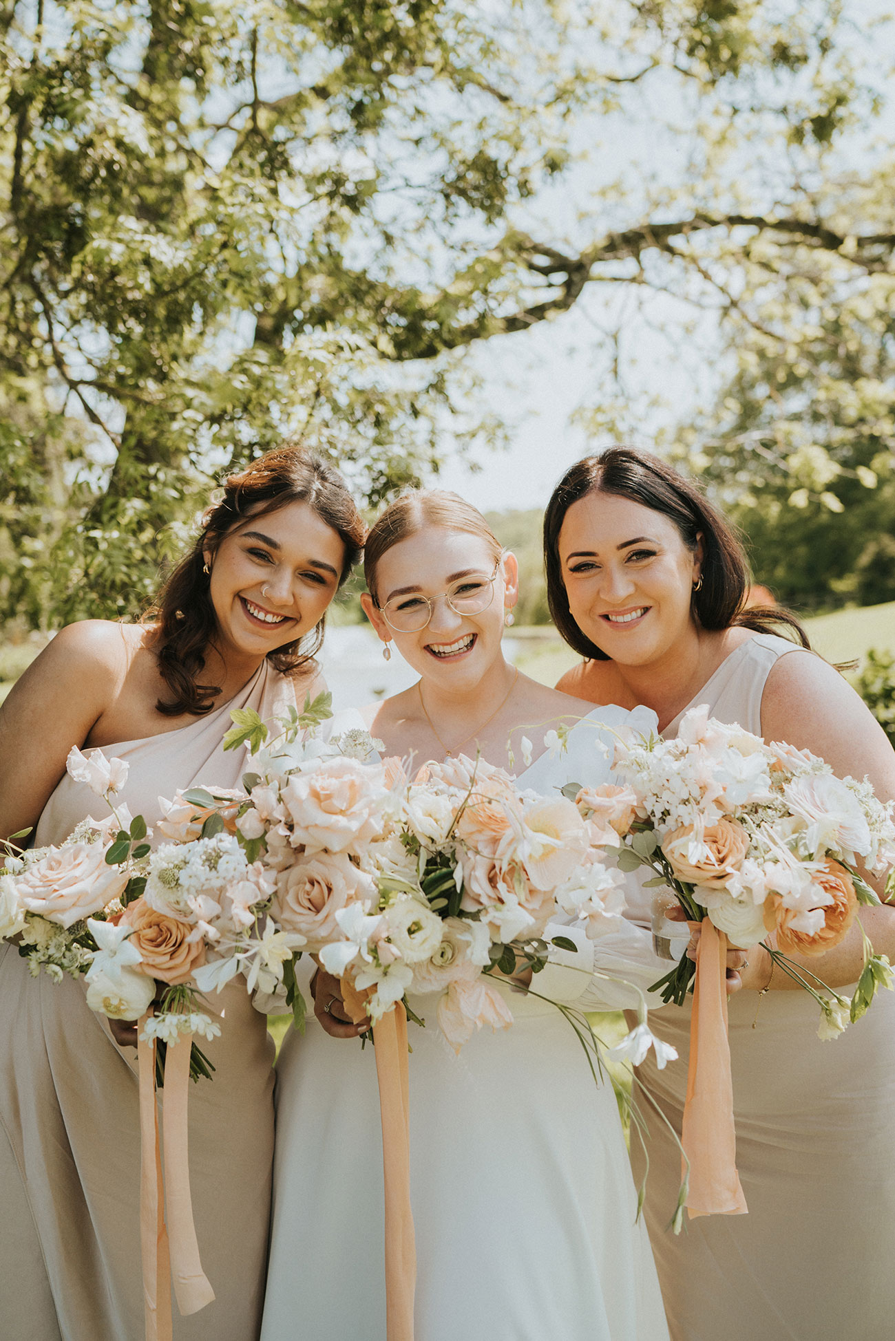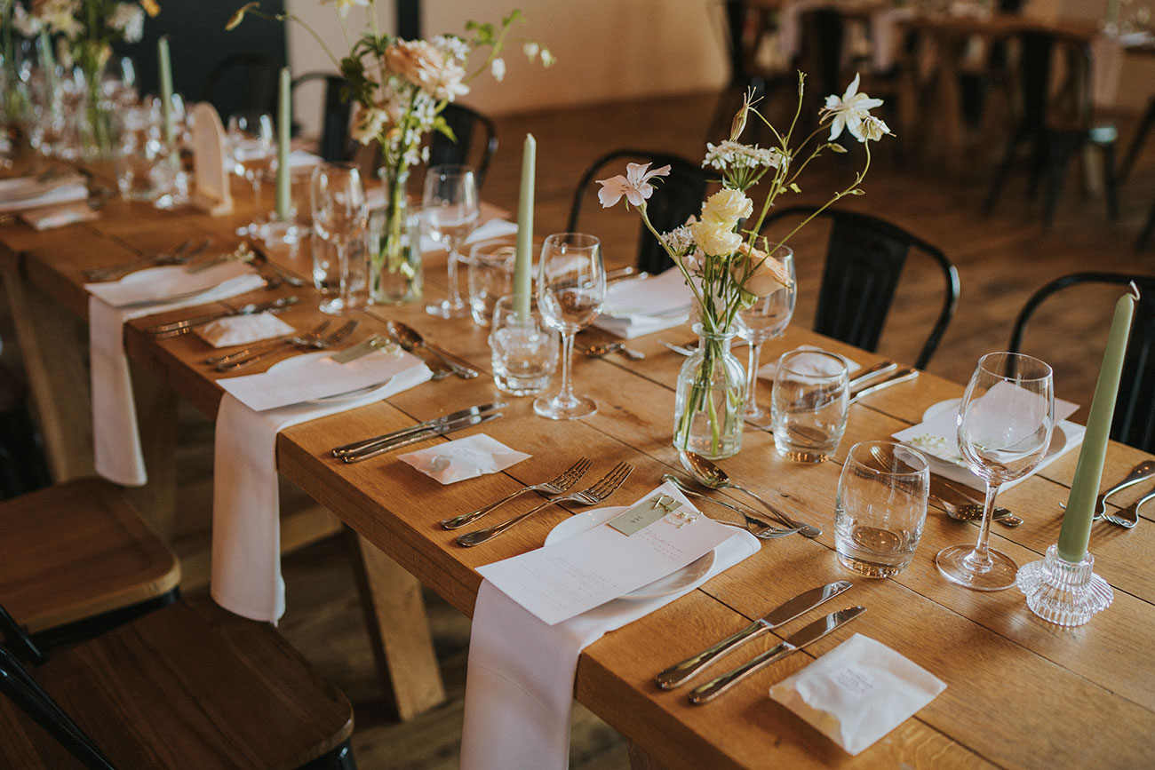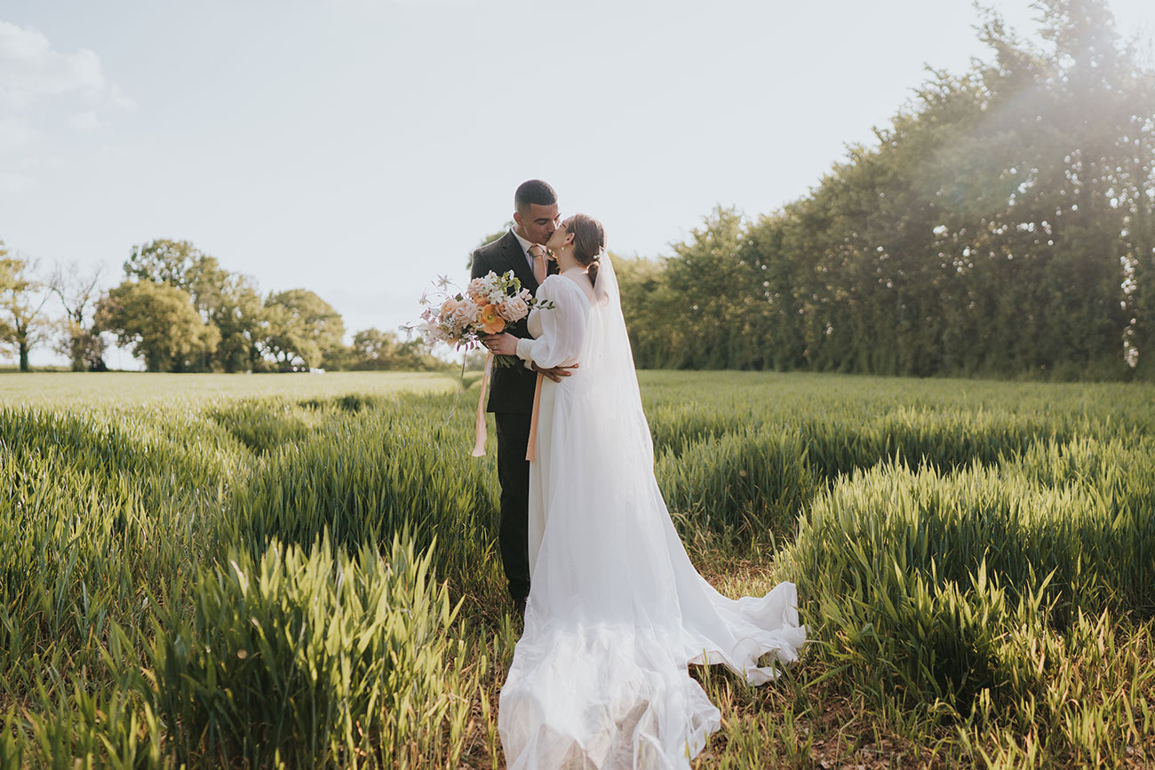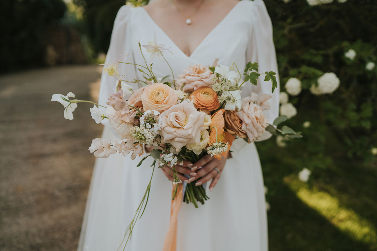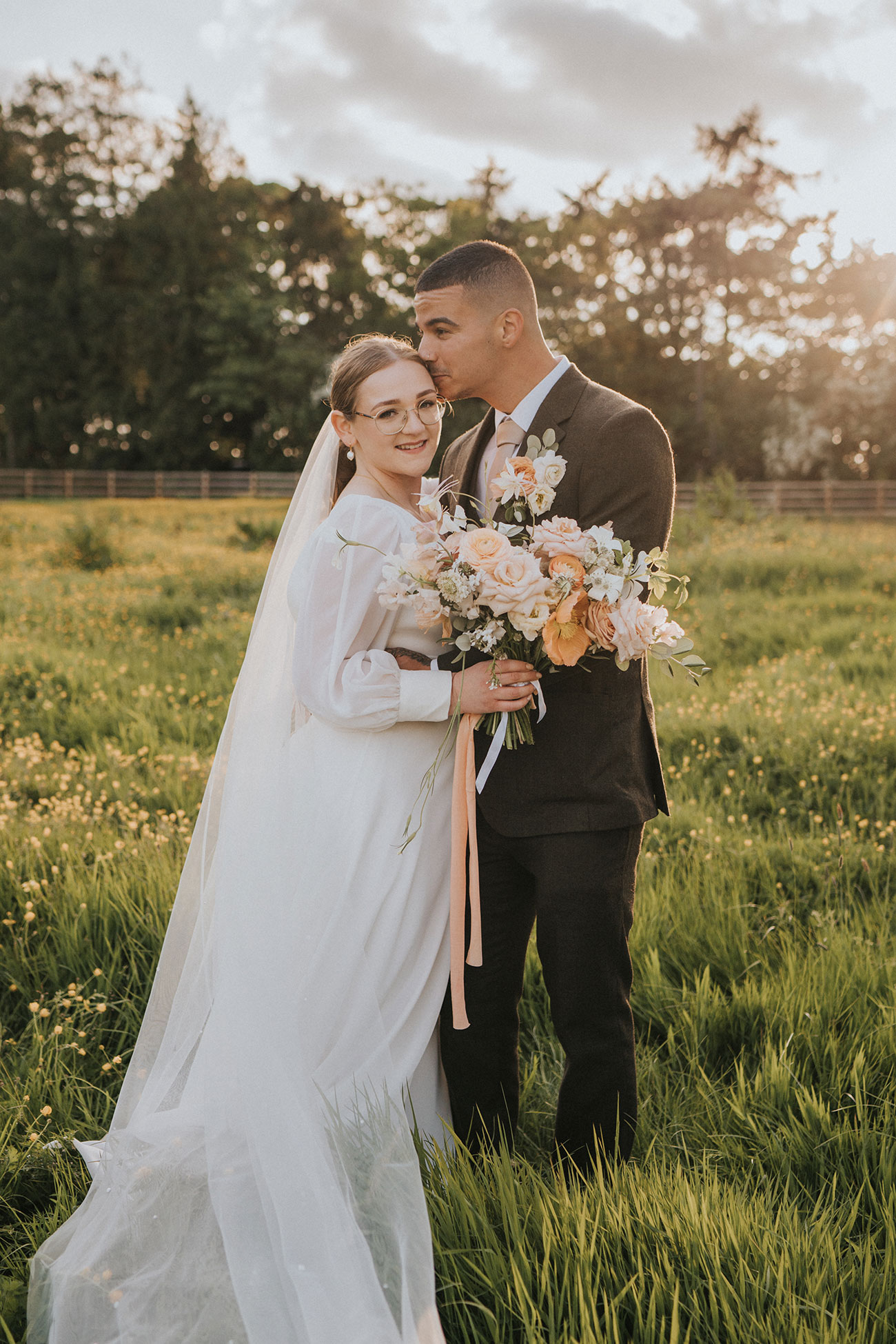 When it came to choosing their wedding venue, there was one location that stood out. “The moment we walked into Upton Barn, we both knew it was where we wanted to get married,” she says. Settling on a calming colour scheme of “neutrals with peachy splashes”, the floral arrangements carried the palette beautifully, with a foliage garland around the ceremony arbor and stem flowers throughout the venue.
