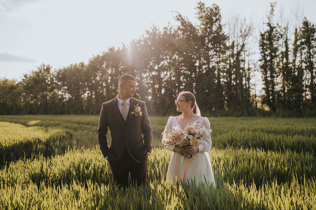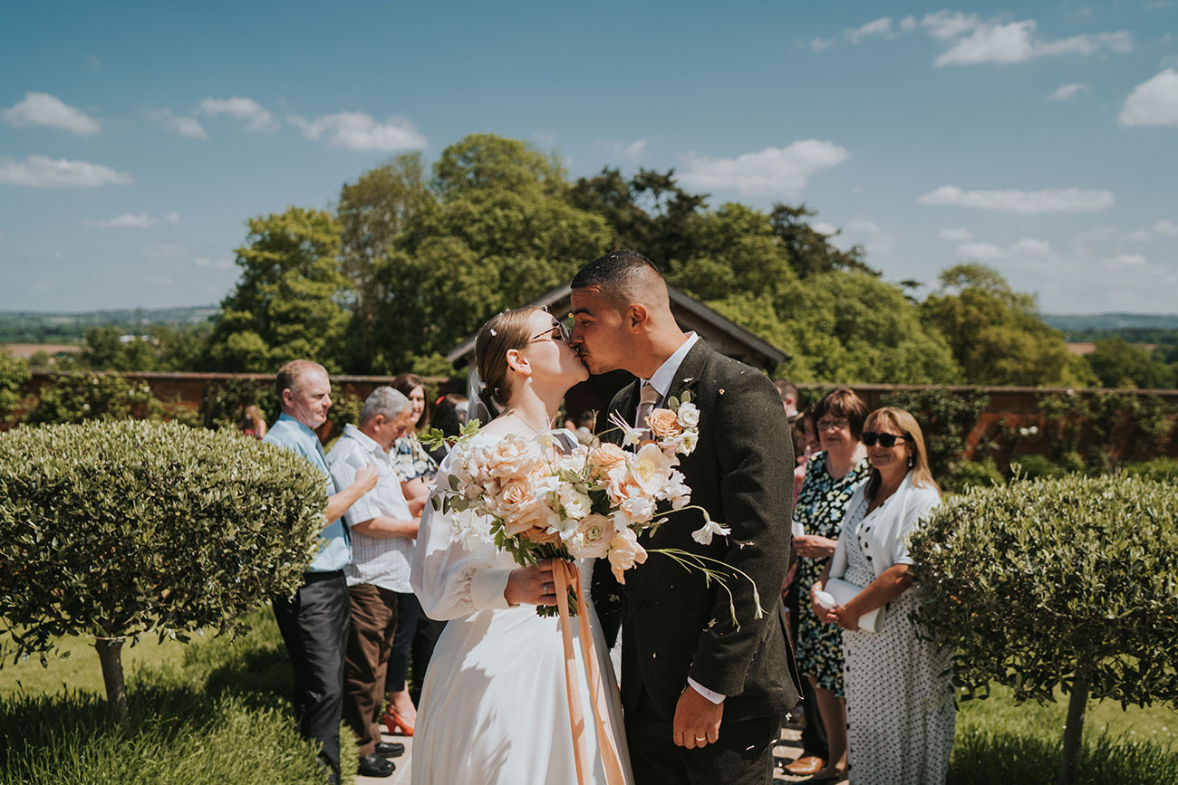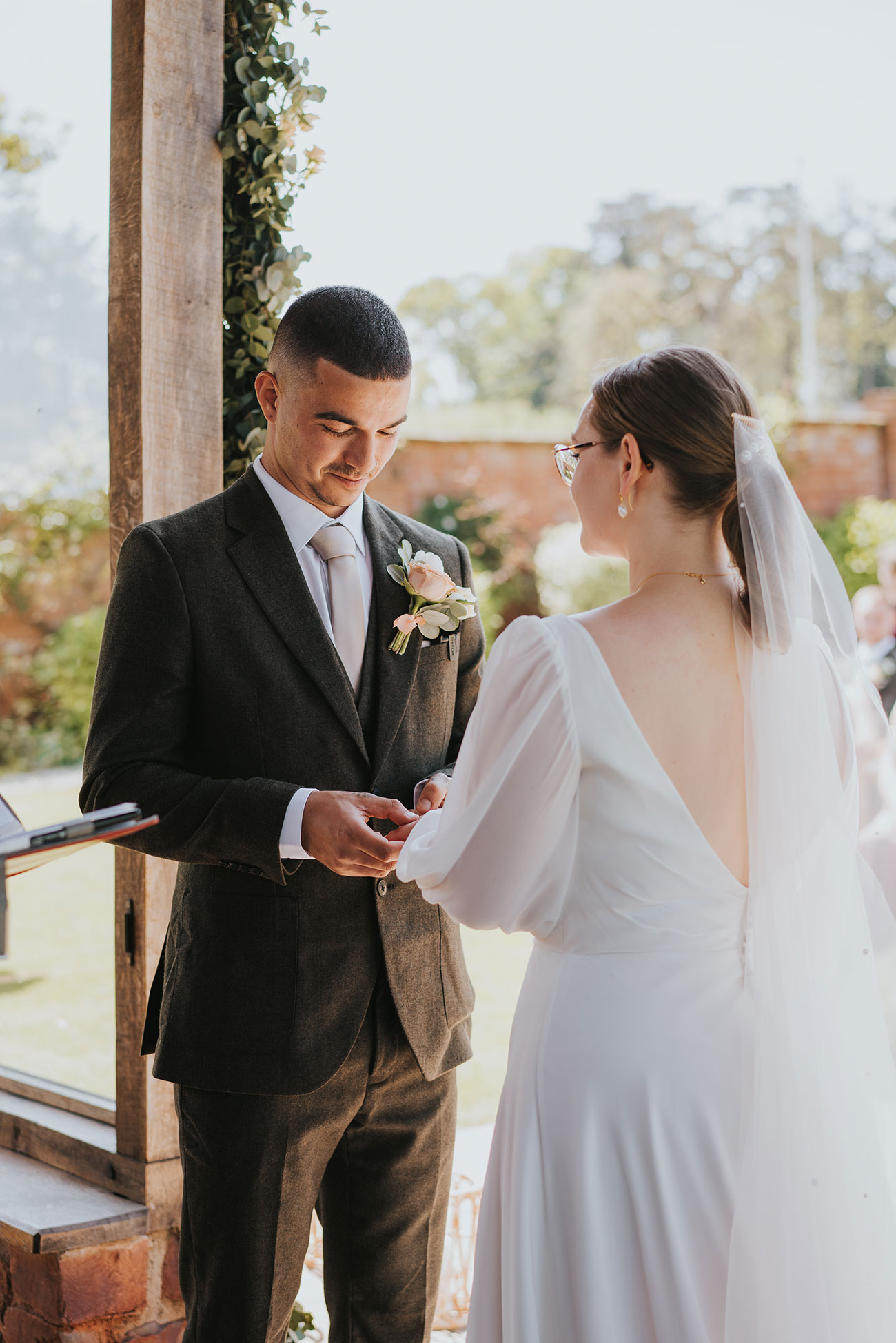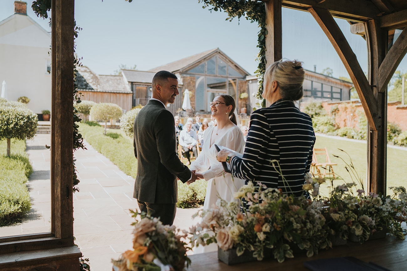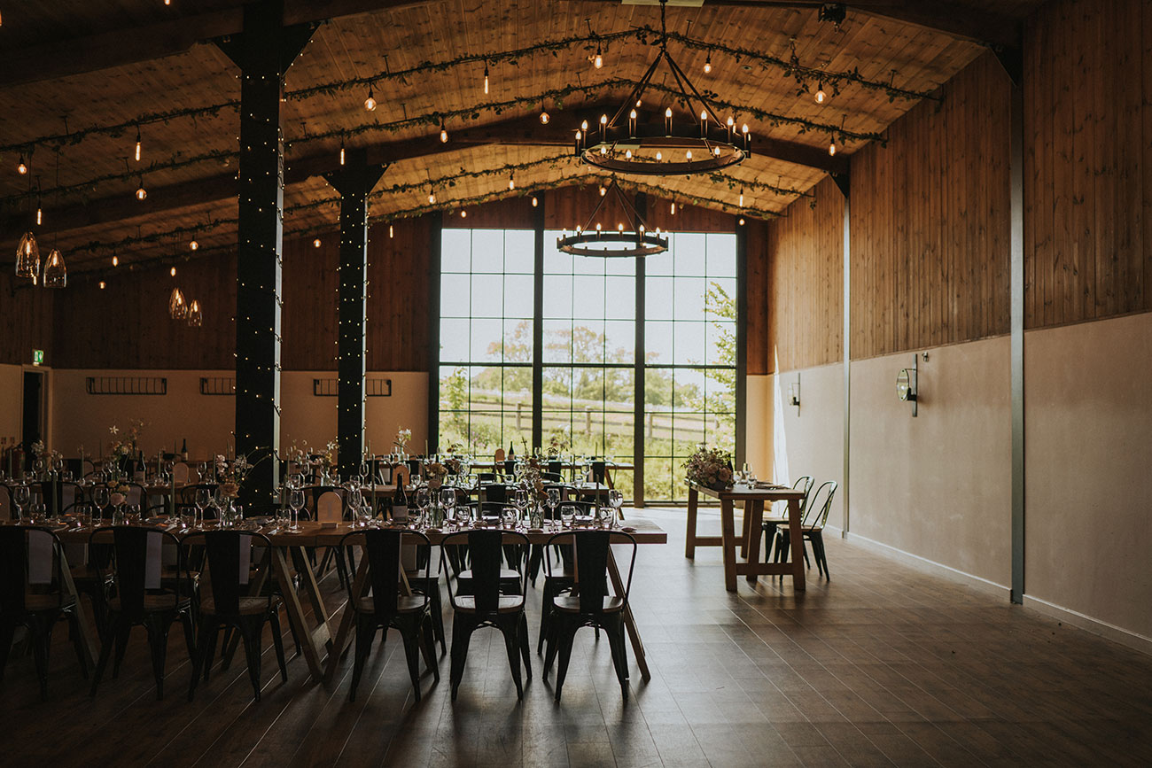 When it came to choosing their wedding venue, there was one location that stood out. “The moment we walked into Upton Barn, we both knew it was where we wanted to get married,” she says. Settling on a calming colour scheme of “neutrals with peachy splashes”, the floral arrangements carried the palette beautifully, with a foliage garland around the ceremony arbor and stem flowers throughout the venue.