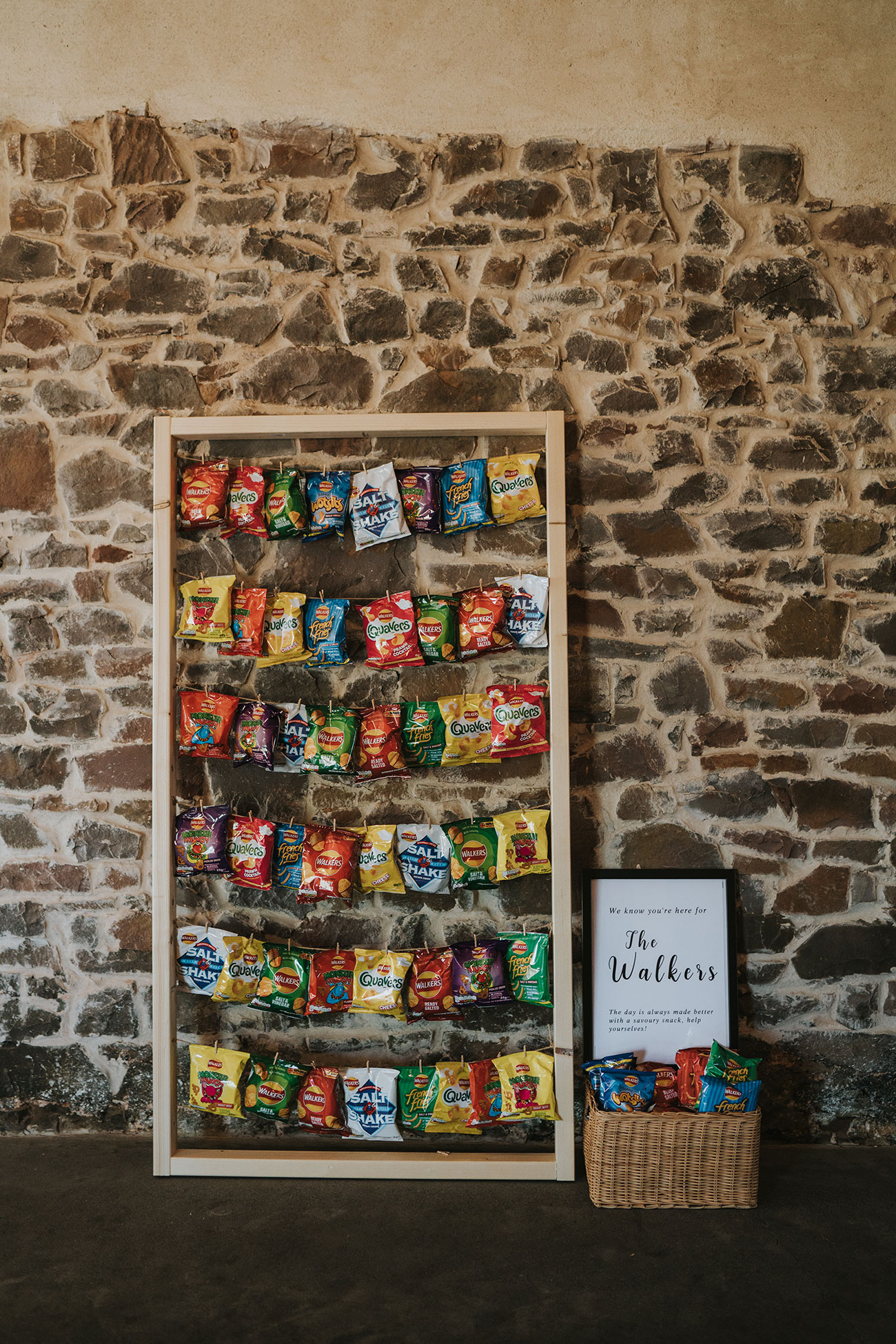 The couple also incorporated personal little details throughout the day. “As we weren’t allowed dogs at the venue, we made a photo frame with our family dogs for drinks signs,” says Lucy. “I also made a photobook of mine and Yousef’s pictures through the years and – as our last name was going to be Walker – we made a crisps wall of Walkers crisps with a sign reading ‘We know you’re here for the Walkers.’”
