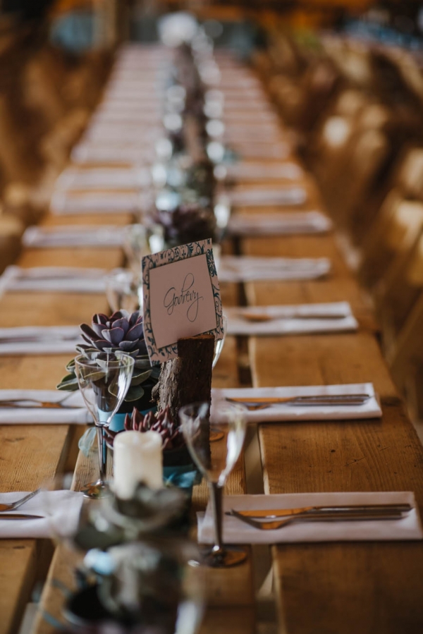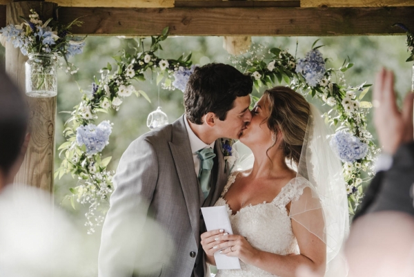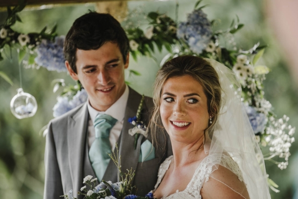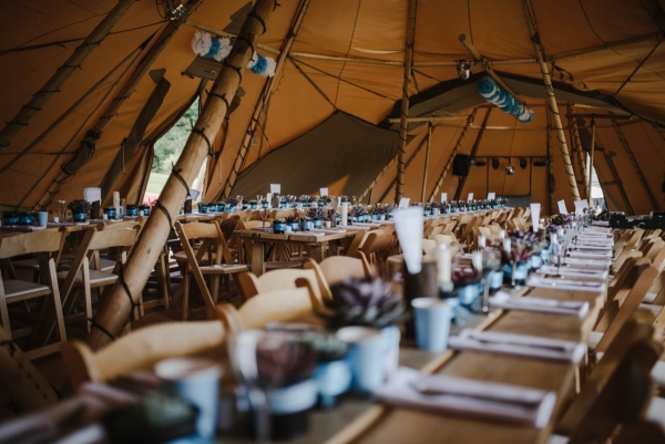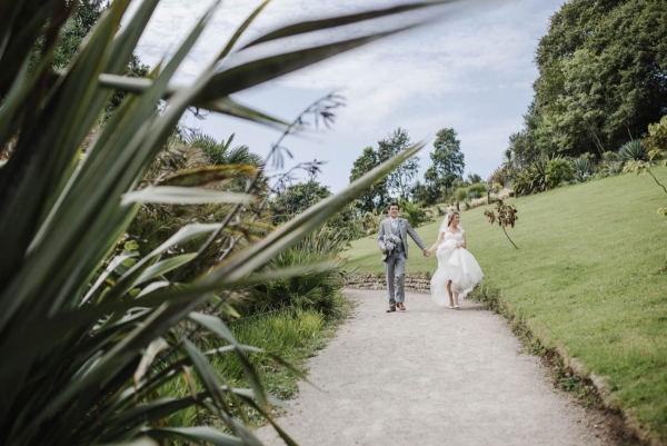 Exactly a year later, the couple exchanged vows at Tremenheere Sculpture Gardens during a sun-spilled ceremony in the pagoda. "The views of Mount's Bay and St Michael's Mount made a stunning backdrop," remembers Megan. Selecting a striking colour scheme featuring blues, silver and white ("like the Cornish sea"), the event took a relaxed "rustic/country/festival" theme, with details such as tables named after Cornish beaches and flowers with a 'just picked' look.