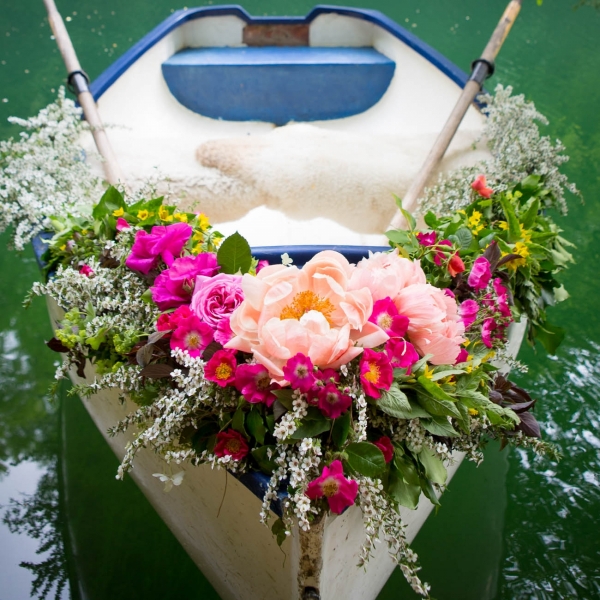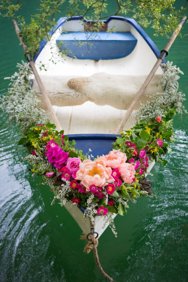 The floral-adorned rowboat, lightly tethered to an overhanging tree by a length of rope, is lifted by the bright colours of the blooms, promising an adventure-filled foray into the beautiful wonderland of azure water.