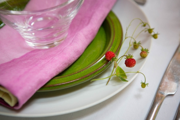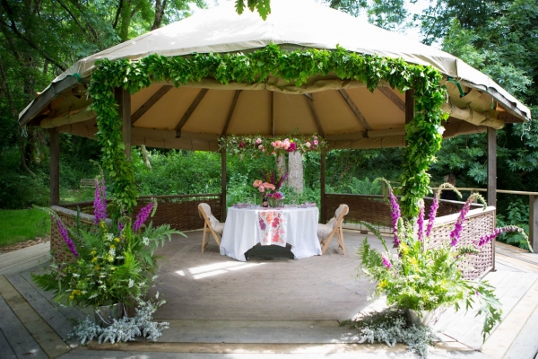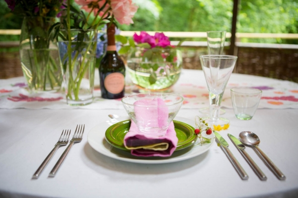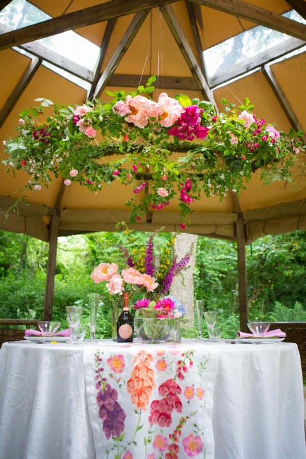 Inspired by 'A Midsummer Night's Dream', the dream-like outdoor aesthetic is beholden to all things natural. A tablescape, nestled into the water-side woodland, is fit for the fairtytale bride and groom, a linen runner hand-painted with foxgloves and dog roses in the same shades as the lively pinks and rich purples of the flowers. The lush background of ferns and deep greens bringing a feel of the forest; you can almost sense the whimsy of fairies in this magical venue.