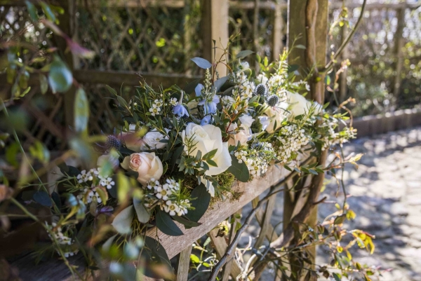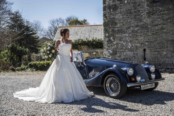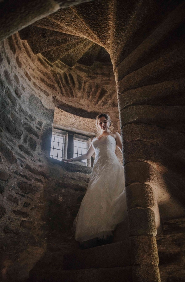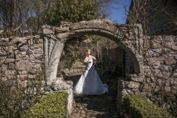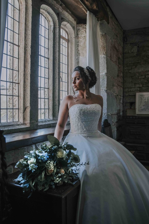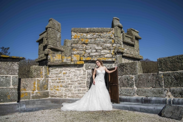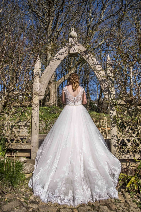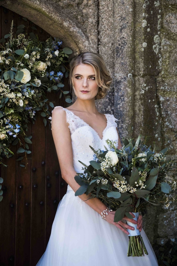 Co-ordinated to showcase the amazing range of gorgeous gowns at The Bridal Studio in Helston, the backdrop of Pengersick Castle allows the dresses to take centre stage. Luxe lace and billowing trains trail delicately over the granite stone steps, standing bright and beautiful against grand castle doorways and old stone walls. The outdoor gazebo brings a lightness to the shoot, an alternative place in which to wed under the sunny skies.