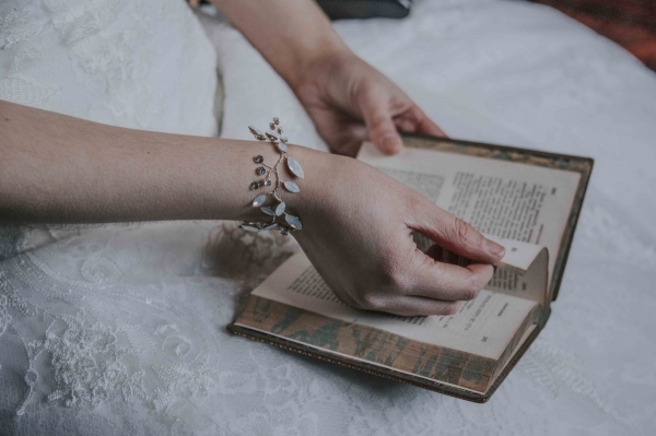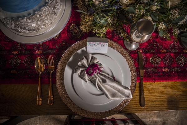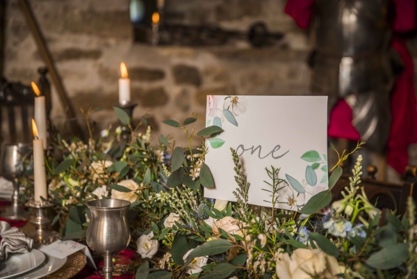 Delicate handmade jewellery complements the starkness of the stone - jewels woven between tendrils of hair brings a softness to the shoot, while the wild and deliciously untamed feel of the flowers show the beauty among the blooms. There's a regal sense of majestic pride among the table settings; rich red runners and gold cast cutlery sit among heavy goblets and imposing candlesticks. The castle stands tall, the dresses divine, and the effect is regal romance at its best.