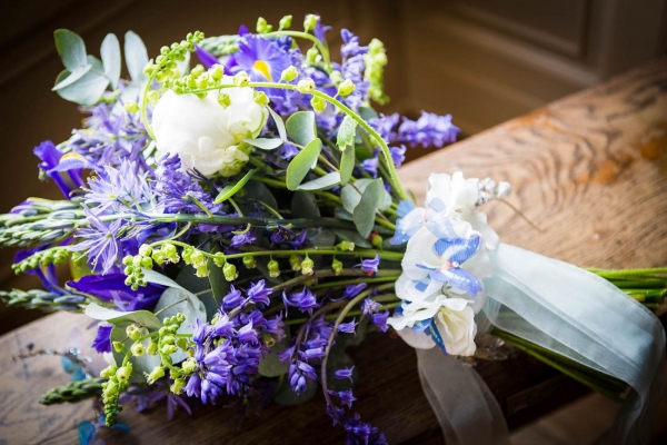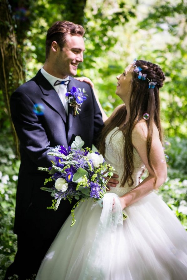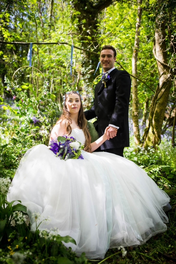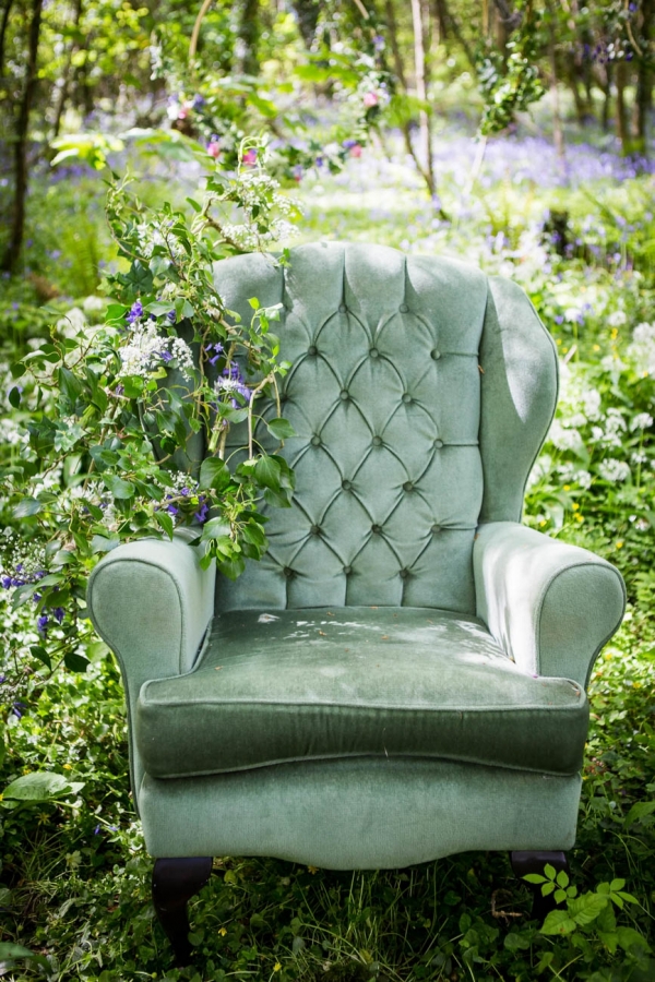 The flowers bloom bright in rich shades of purple and deep reds, standing proud against the backdrop of bluebells and wild garlic flowers, offering a chance for the bride to walk among the trailing flora, juxtaposing with the option to sit awhile on a plush velvet throne.