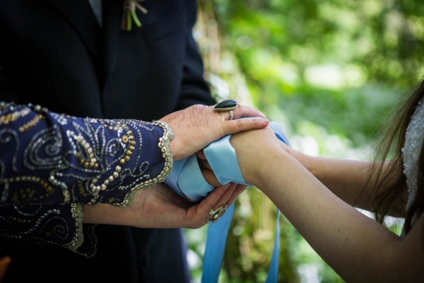 Hair styling in the form of long tendrils and loose curls adds to the outdoorsy, natural vibe, with barely there make-up allowing the bride's beauty to shine bright, while a hand-fasting ceremony brings a celtic nod to proceedings.
