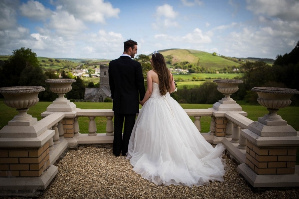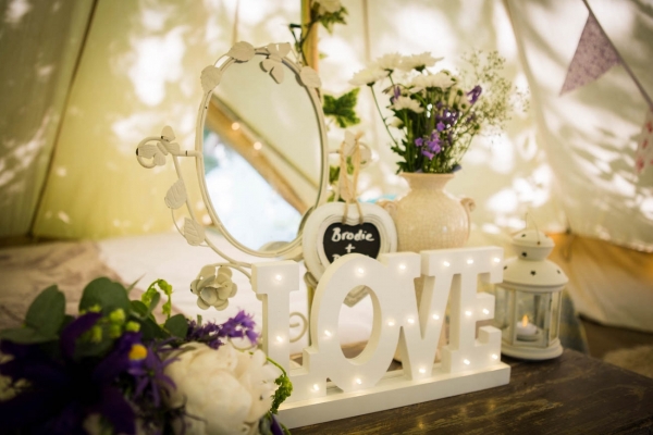 Nestled deep in the grounds is a hidden yurt, decorated with bunting and with a boho-luxe aesthetic to add a laid-back dimension to the styling, before the imposing backdrop of the impressive castle-like manor house stands mightily behind the couple.