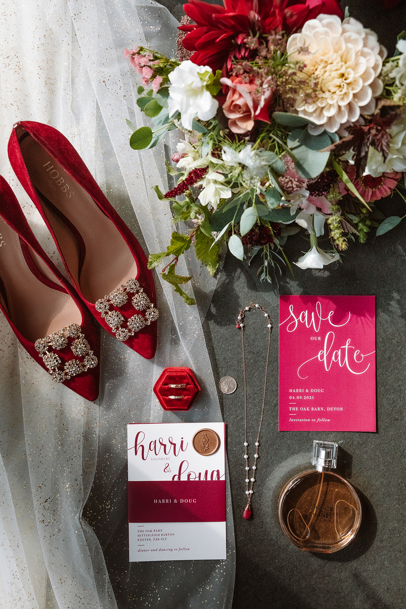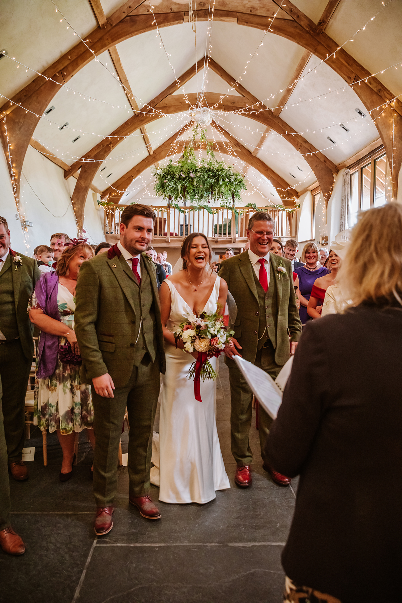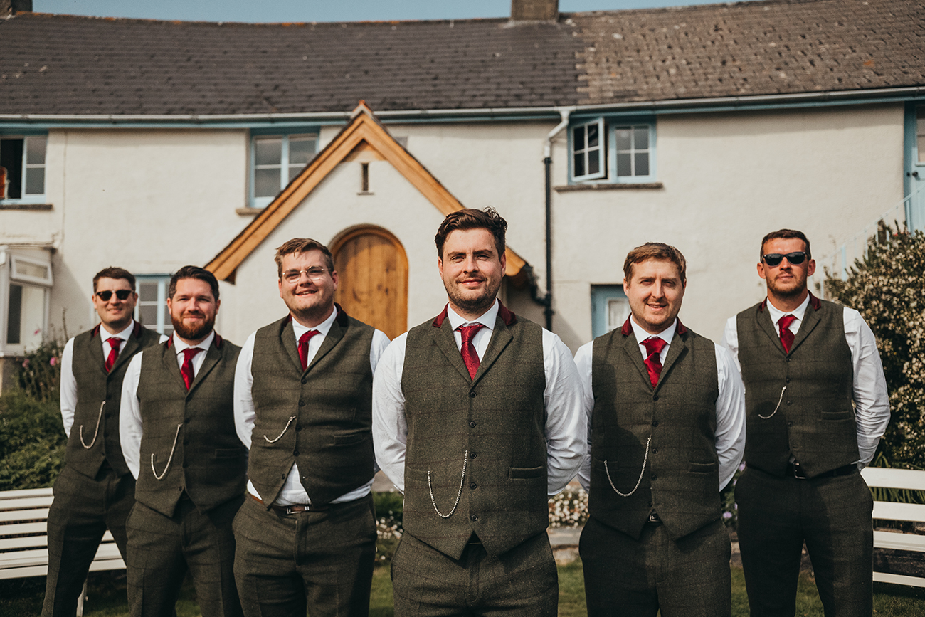 The Oak Barn was the first venue that they viewed, and it was love at first sight. “We love Devon and knew that was where we wanted to tie the knot,” explains Harri, whose favourite colour, red, featured everywhere from the bridesmaids’ dresses and bridal shoes to the table napkins for their autumnal celebrations. “Doug really liked the idea of green tweed, so the main colours came from that, while I also sneaked in a lot of gold!” she says.