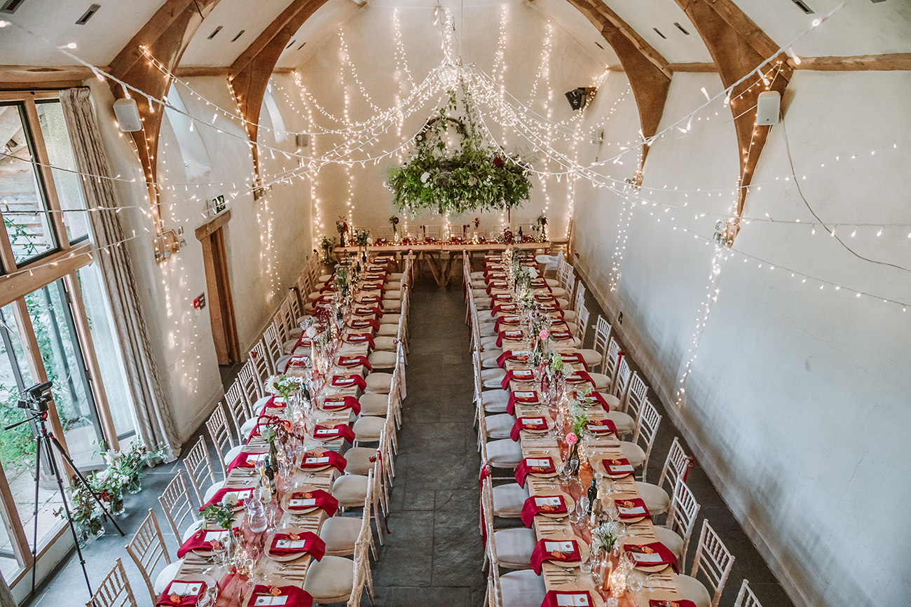 The flowers were instrumental in achieving the look, reflecting the day’s palette of reds, dark pinks, creams and lots of greenery. Eye-catching hanging arrangements adorned the main barn, while “the chandelier was something else!” Harri notes.