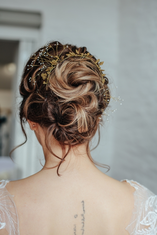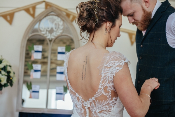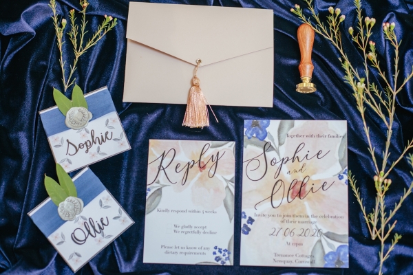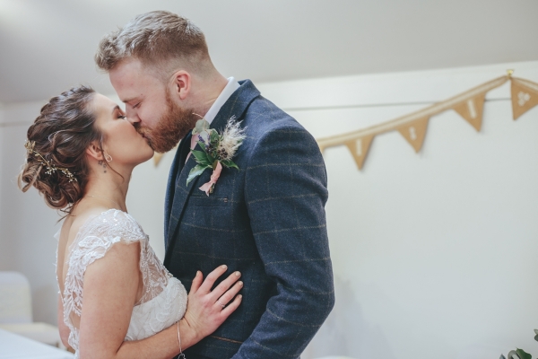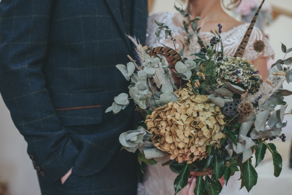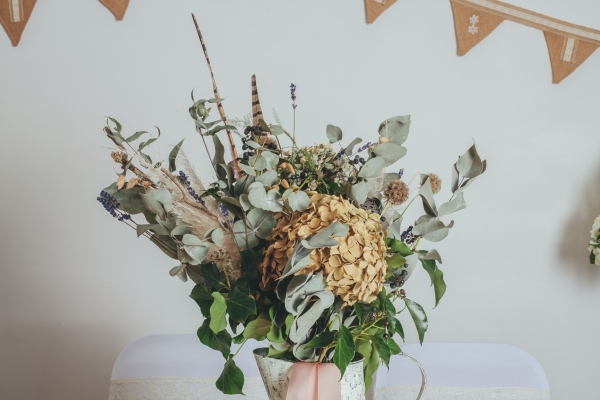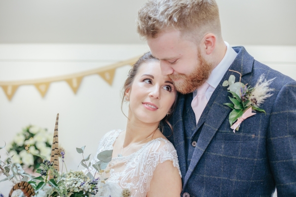 From the bride's soft updo with loose tendrils and dainty floral headband to the exquisite open back and beading on her beautiful vintage-style gown, the scene is one of pure, rustic-style romance. Complete the look with a pretty palette of blues, greens and soft peaches - as picked up in the stationery and table decor and carried in the on-trend dried flower bouquet that throws a smattering of foliage and greenery into the heady mix.