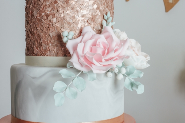Then there's the groom, who enjoys his own sartorial moment in the spotlight, donning a dapper dark blue suit softened with checks and a baby pink tie that mirrors the jaw-dropping cake: a show-stopping centrepiece of marbled greys, pinks and decadent rose gold and copper tones.
