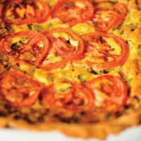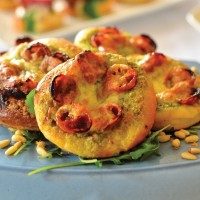 Topped with a fresh basil, rocket and toasted pine nut pesto, finished with buffalo mozzarella and slow roasted plum tomatoes