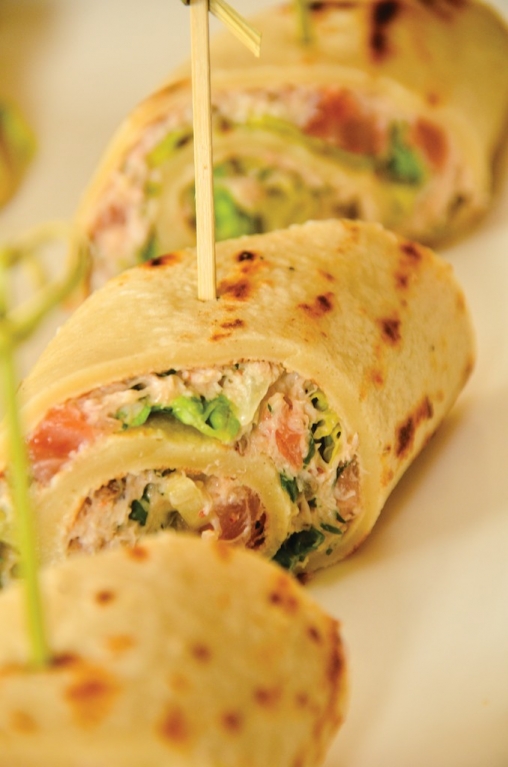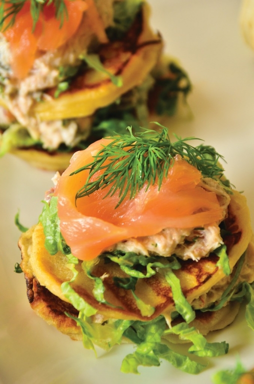 Home-cured salmon, crab, caper and dill pancake roulade slices