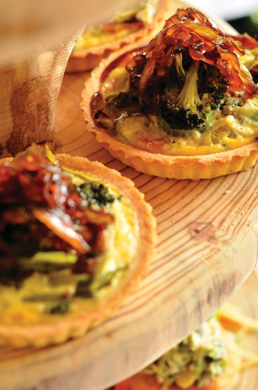 Individual Cornish blue cheese, broccoli and caramelised onion savoury baked egg custard tartlets