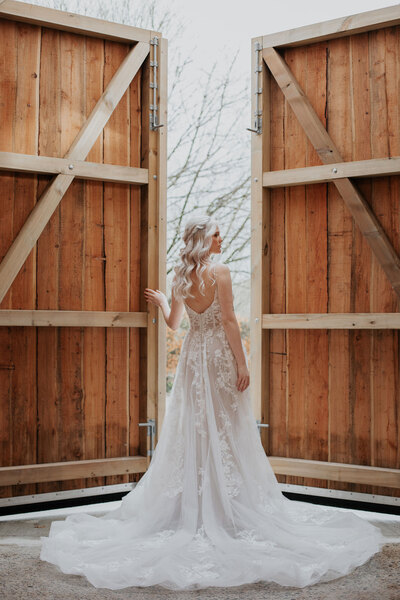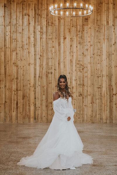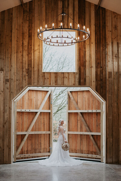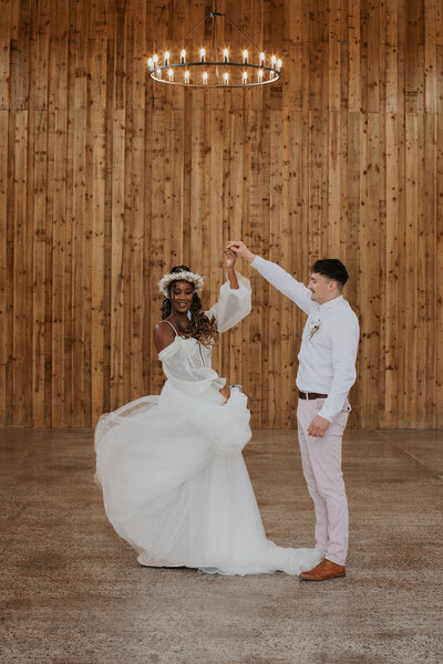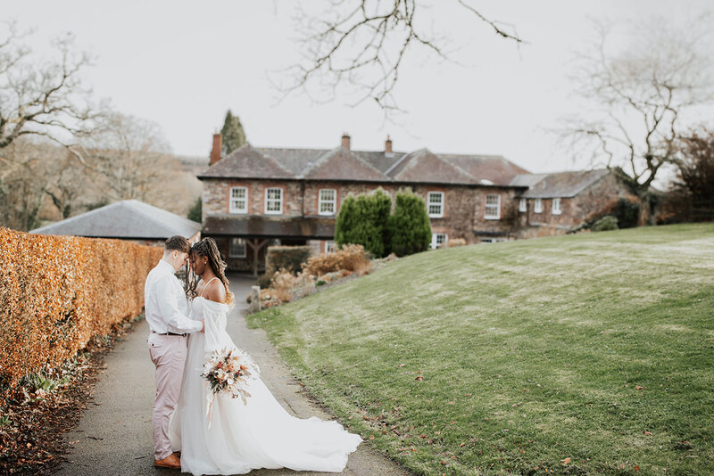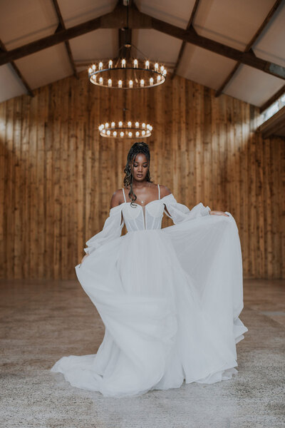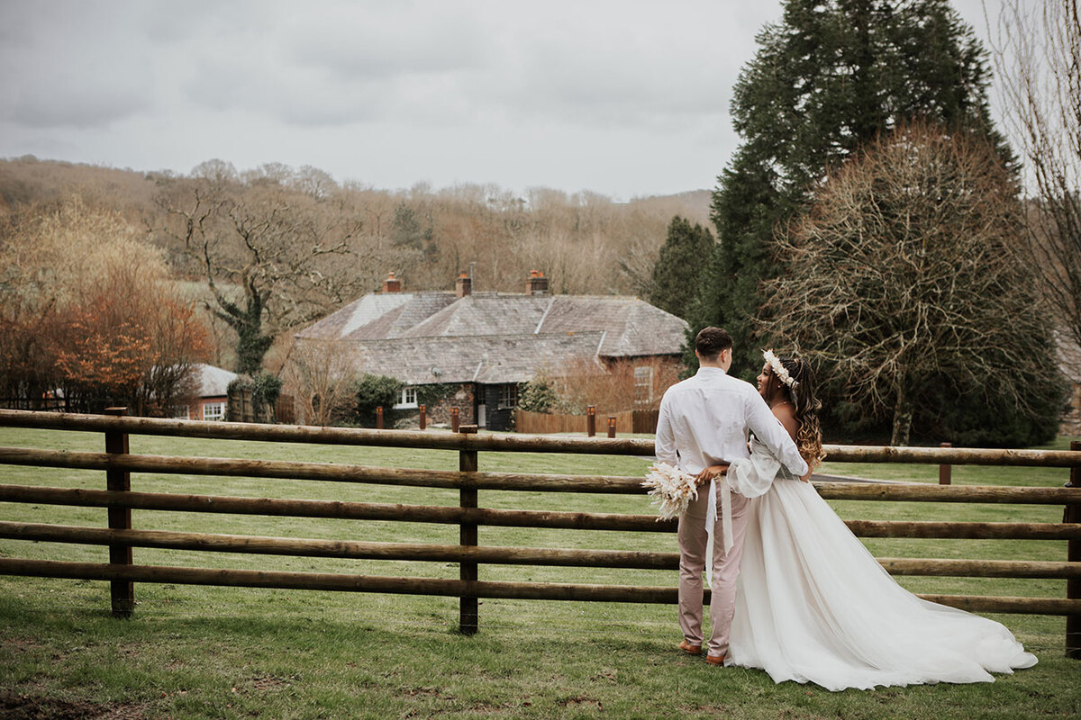 Straddling the Cornwall-Devon border, where the banks of the River Tamar greet the River Lyd amongst 500 lush acres, Wooladon Estate provides the picture-postcard backdrop for this ethereal editorial, which showcases the country venue and its new wedding barn to inspired effect. The former cow shed has been transformed into an enchanting celebration setting, with high ceilings, rustic beams and stunning chandeliers casting a soft glow upon the polished floor and warm wooden panelling.