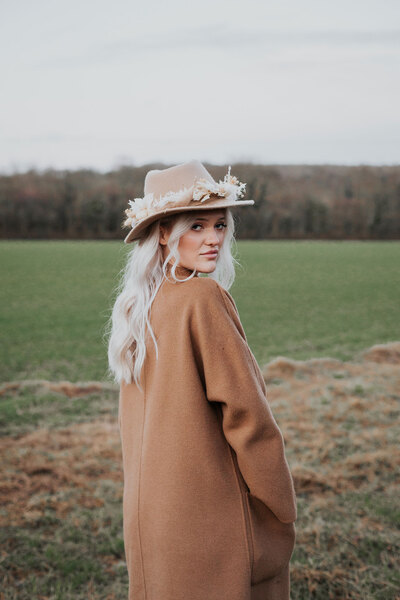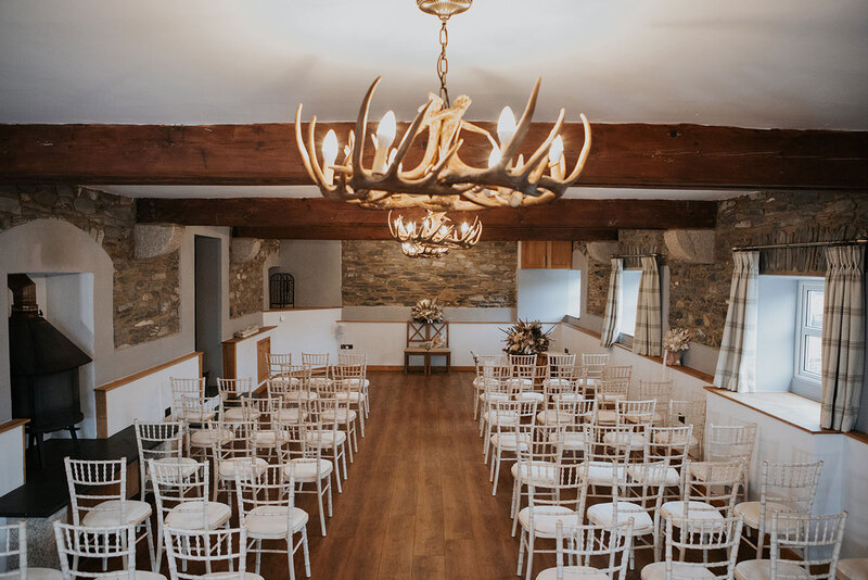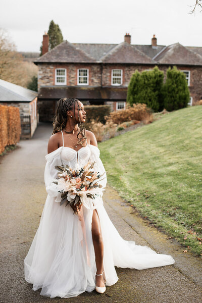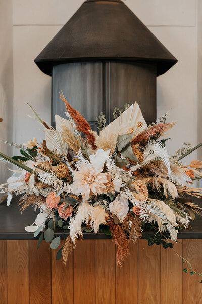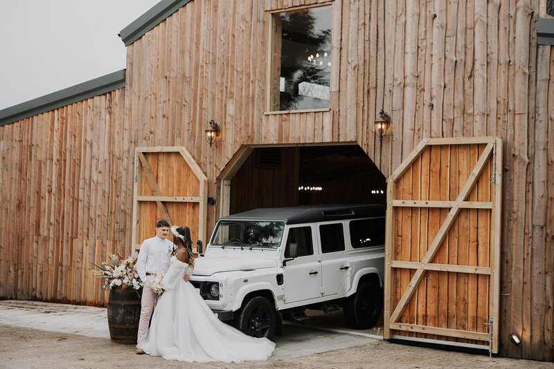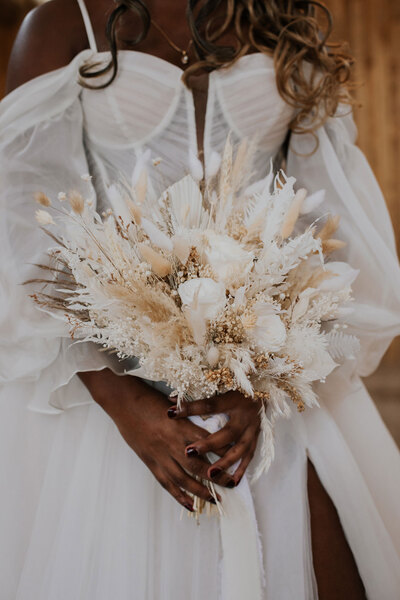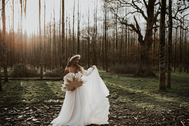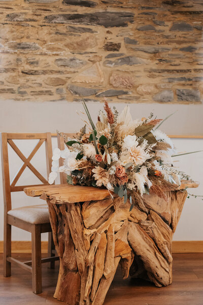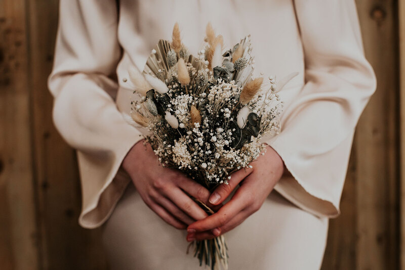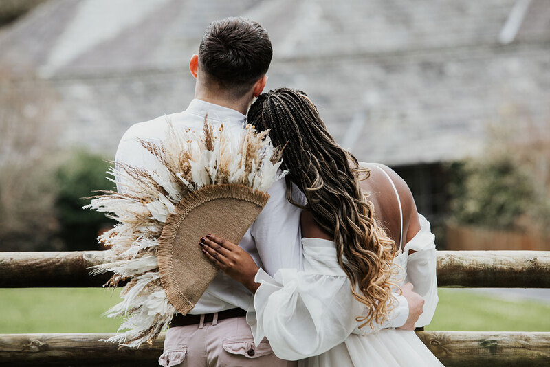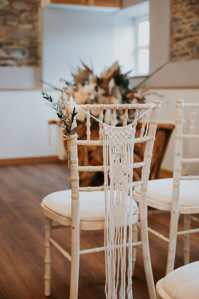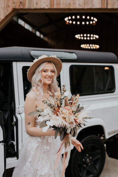 In keeping with the close-to-nature charm of the venue, a bohemian, free-spirited mood carries throughout the shoot. Dried florals in sand, cream and pale pink tones with rich accents of green and russet complement the barn’s exposed wooden structure and rural canvas beyond. Simple macramé chair sashes are paired with pew end posies of gypsophila, pampas grass and sprigs of foliage, while the accessories continue the pared-back, petal-pretty aesthetic with bouquets, buttonholes, flower crowns, floral fan and fedora all adorned with textured blooms.