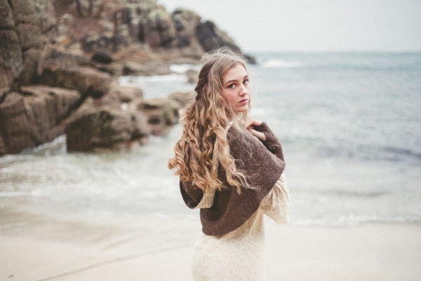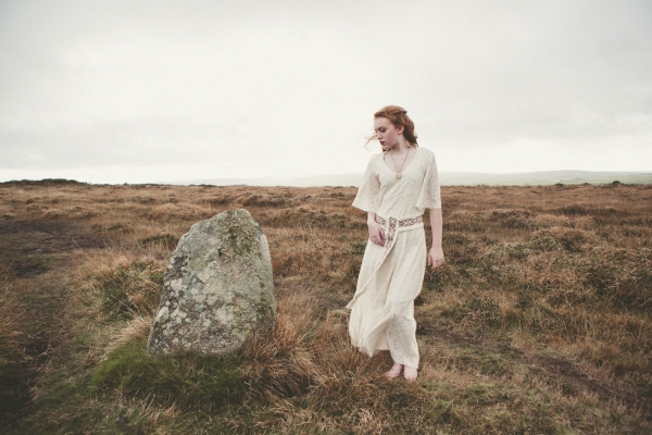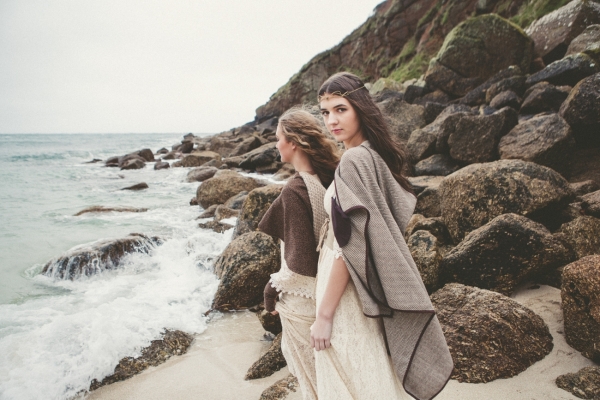 A cosy winter set-up at Boho Cornwall is complemented by the two outdoor locations of Porthgwarra Beach and the Nine Maidens, an ancient stone circle. The Celtic spirit is strong here, enhanced by authentic gowns and jewels, together with the brides' free-flowing hair and pale skin. The rings are cast with sand from the shores of nearby Sennen, while the wild wreath and pottery inspired by the stag, thistle and tree of life bring the connection of nature married with the beauty of Celtic tradition.