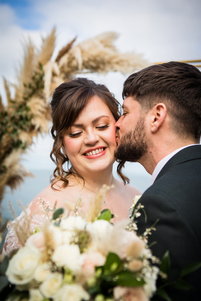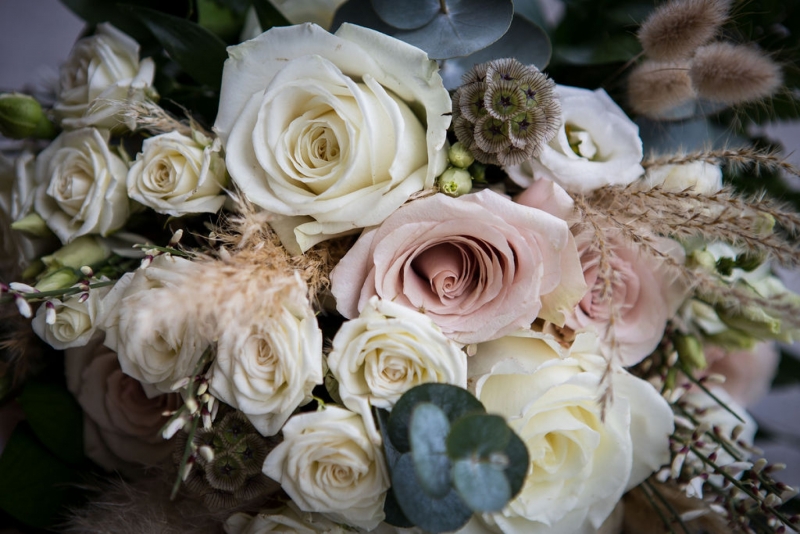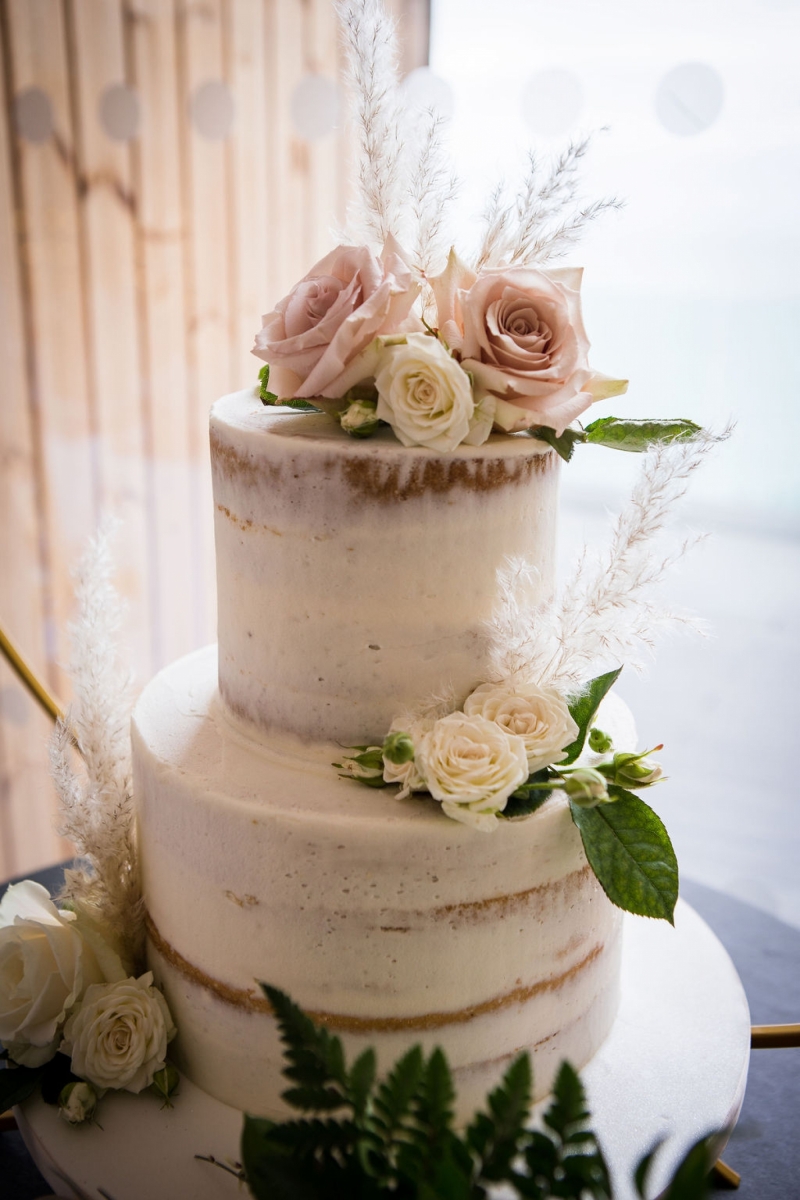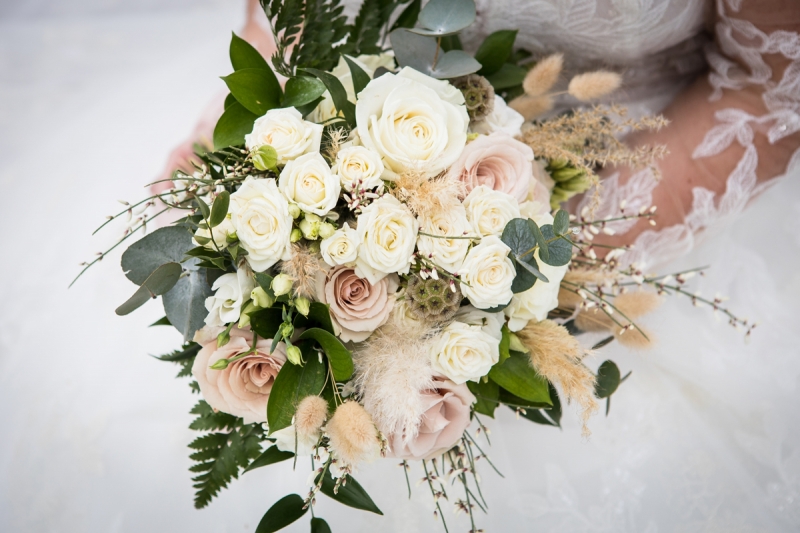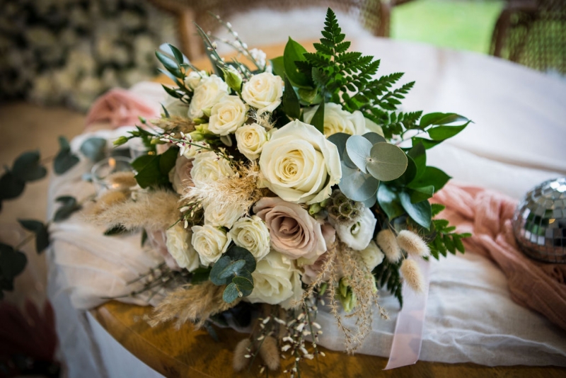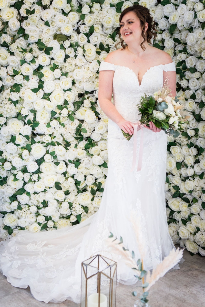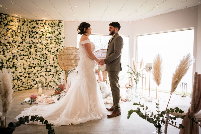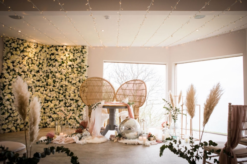While The Venue's natural palette provides a cool, pared-back aesthetic, the decor is used within the shoot to striking effect to both accentuate and contrast with the natural look and feel of the space, from boho-inspired pampas grass and peacock chairs to the cream coloured blooms and statement flower wall.