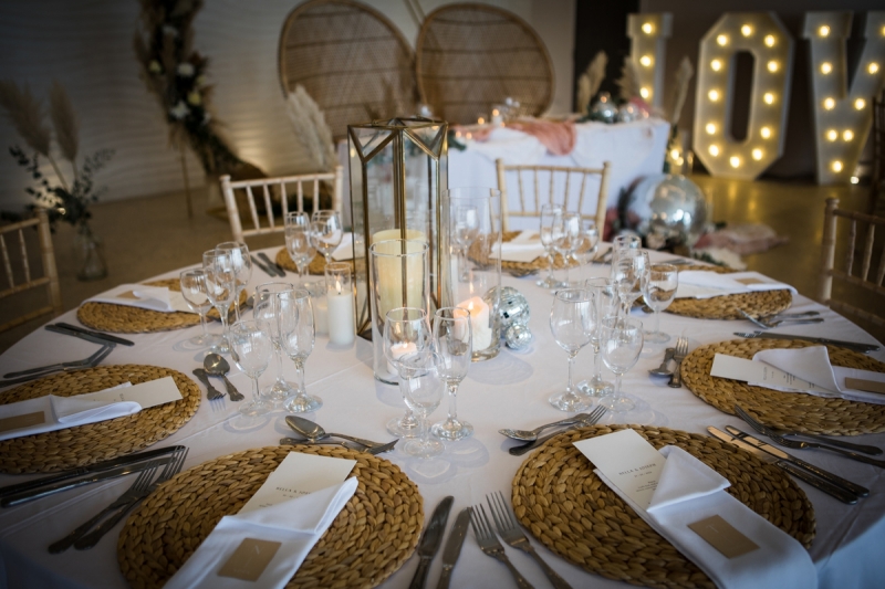 A subtle hint of glamour and frivolity is infused via silver accents and disco ball features, while the warm glow of candlelight and retro-style light letters provides the perfect atmospheric touch. The bride's off-the-shoulder sweetheart gown oozes old-school romance, while her beau is a picture of classic-meets-contemporary groom's style with a light sage suit and dark green two-piece with dried flower boutonierre. A semi-naked cake, delicate jewellery, stunning stationery, and textural decor completes the romantic winter scene with a free-spirited wild edge.