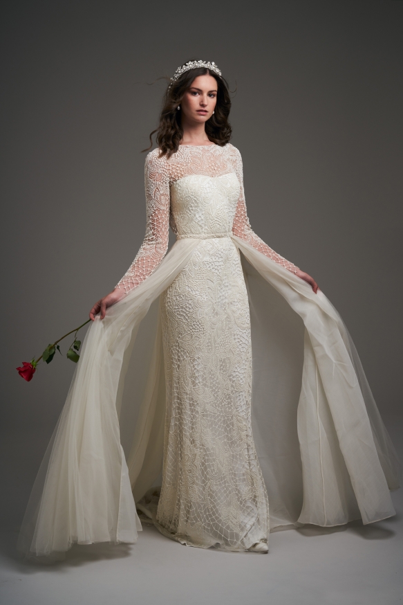 Layering is key. Light-as-air skirts, bridal separates and sleek shifts work fabulously with capes, long-sleeved tops, and detachable overskirts and trains, which can be combined to create a beautifully bespoke and all-weather ensemble.