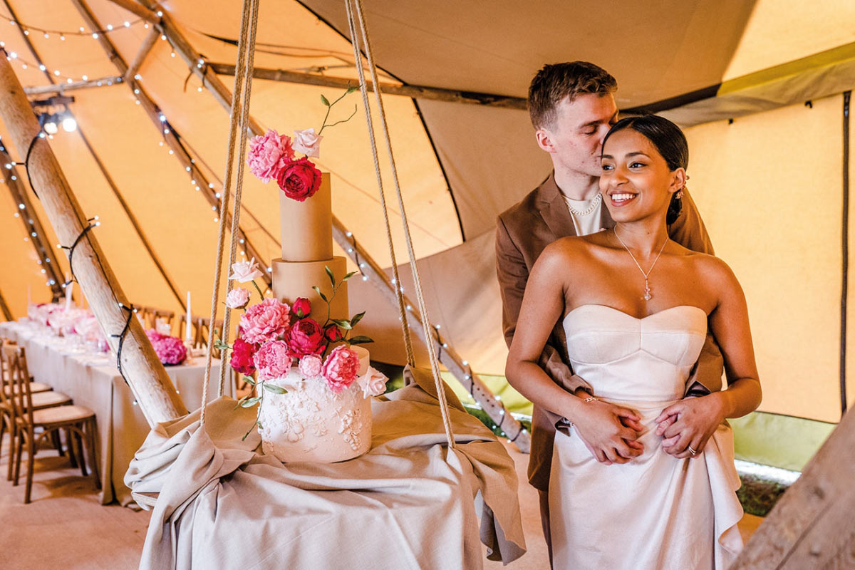 One of the many beauties of a tipi wedding is its versatility and, as this styled shoot illustrates, the striking Nordic structures can work for a range of design schemes. “This shoot started as an idea to show that you don’t have to go for full-on festival vibes or rustic style just because you’re getting married in a tipi in a field or garden,” explains stylist and coordinator Nikki Sherriff of Knots & Kisses. “Tipis can also have a beautiful, elegant feel and, as a stylist, that’s what I set out to prove. So it’s out with the rustic wooden tables and folding chairs and in with the elegant crossback chairs, fully dressed linen tablecloths and beautiful fringed napkins!”