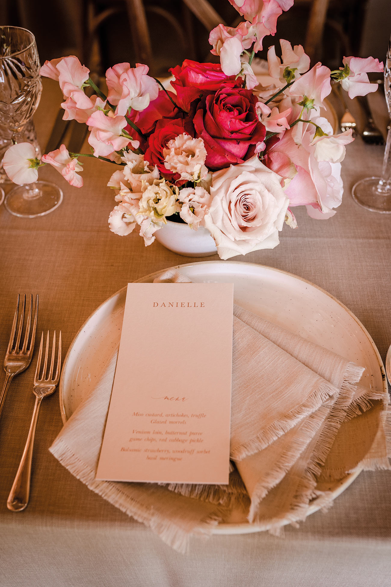 The aesthetic continues with the bride and groom; the groom dons a relaxed, modern suit reflecting the neutrals of the chosen palette while the bride exudes a polished grace with structured details and drops of crystal jewellery and hairpins. Elegance is certainly achieved, and with it a sense of stylish sophistication.