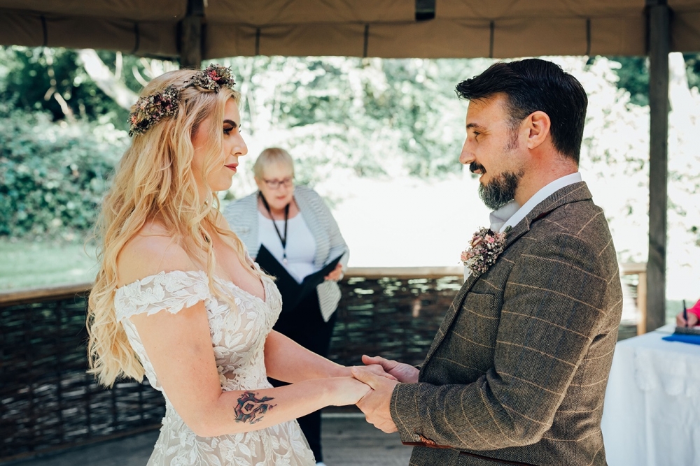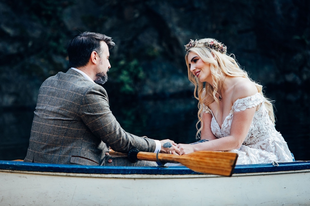 The mid-afternoon ceremony was followed by a mini adventure around the picturesque grounds. 'Exploring the area was one of our highlights; we both love exploring and we ended up climbing an oak tree, rowing on the lake (I decided to dip my toes in and almost tipped us both in!) and hiking through fields on the day. It all felt so wild and boho,' she says.
